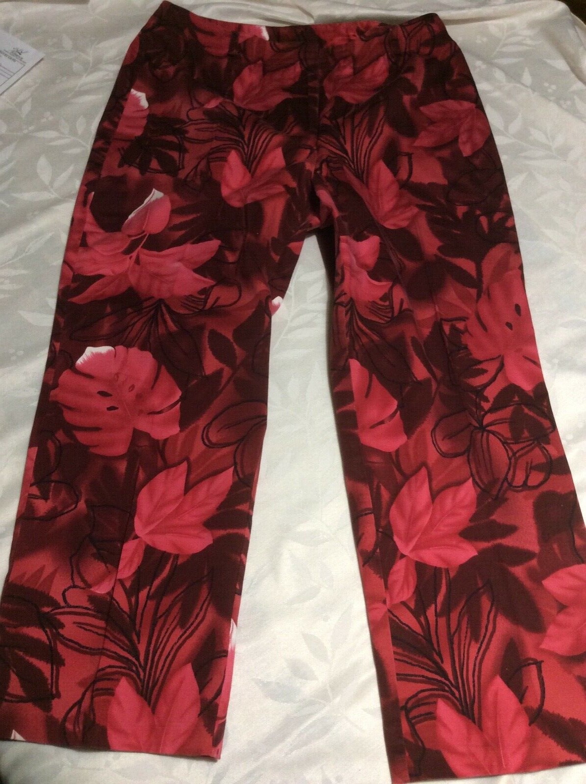 Leaf Print Leslie Fay L 12 Capri Pant Floral Stretch Red TROPICAL Pocket Holiday