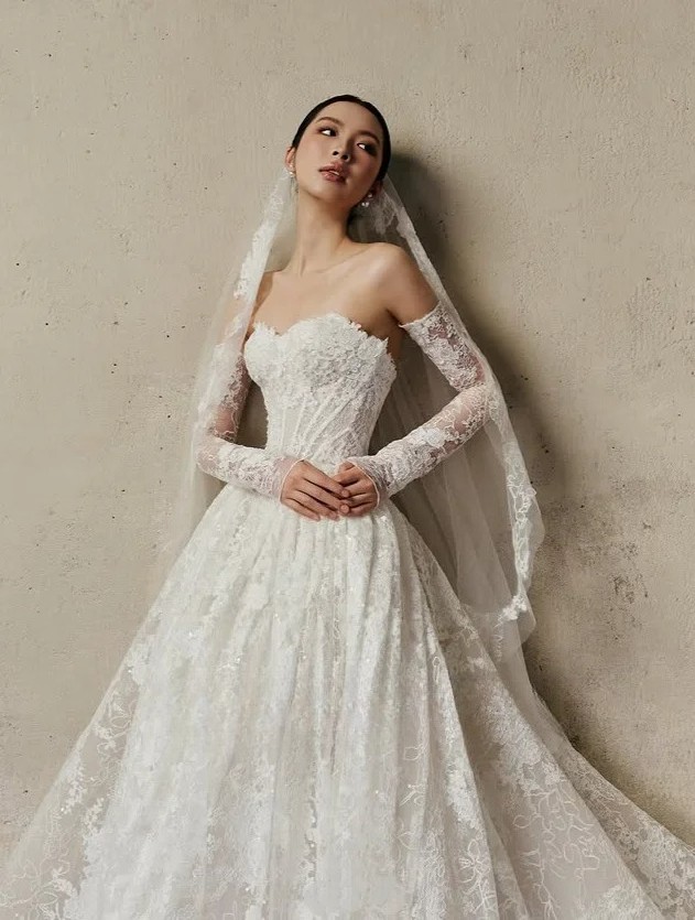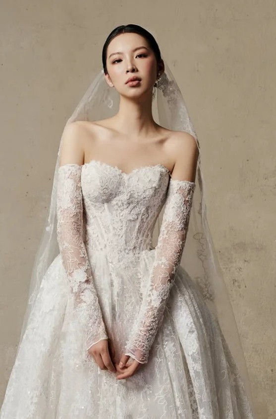 как выглядит Elegant Lace Wedding Dress Strapless Train-Length A-Line Pleated Bridal Gown фото