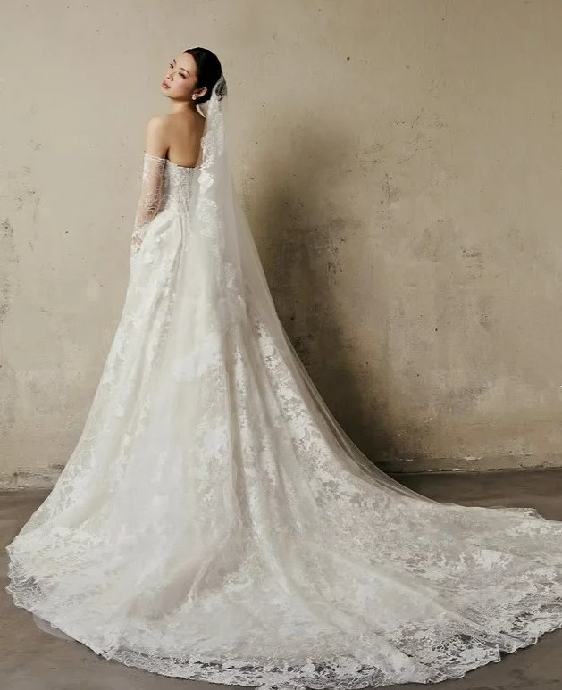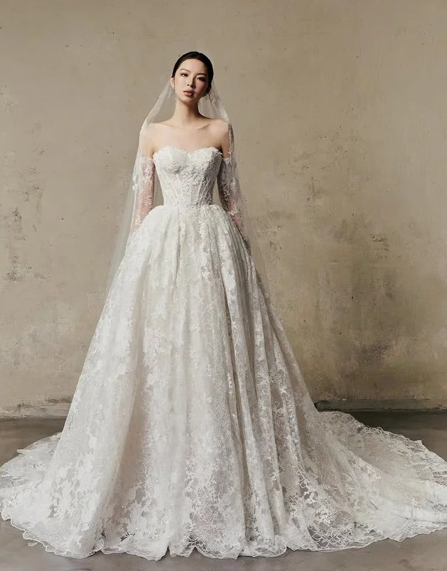 Elegant Lace Wedding Dress Strapless Train-Length A-Line Pleated Bridal Gown
