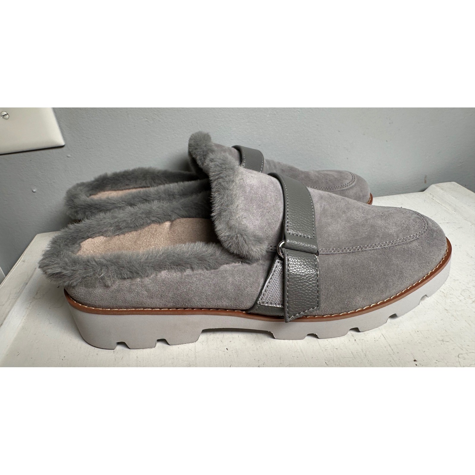 как выглядит Vionic Gray Suede Faux Fur Lined Adjustable Buckle Accent Mules фото