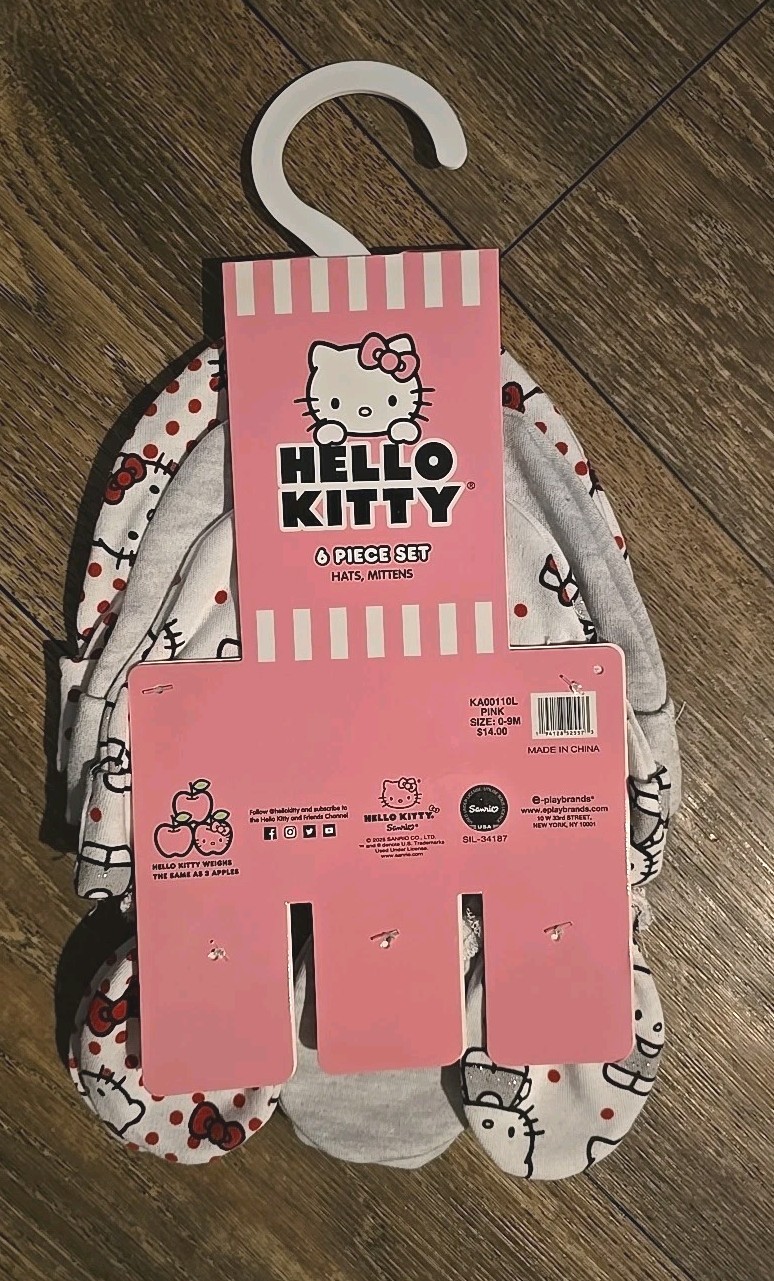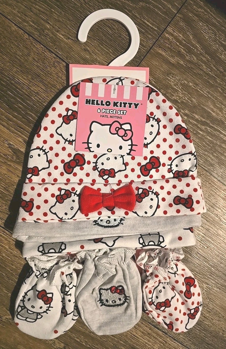 Hello Kitty Baby Girl 6 Piece Set Hats Mittens Polka Dots Red New with Tags