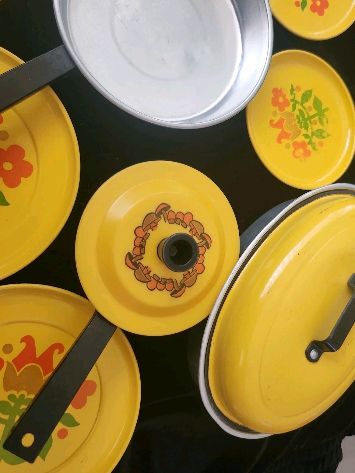 как выглядит Cute Vintage Kids Toy Kitchen Set Yellow Flowers 23 Piece From 60