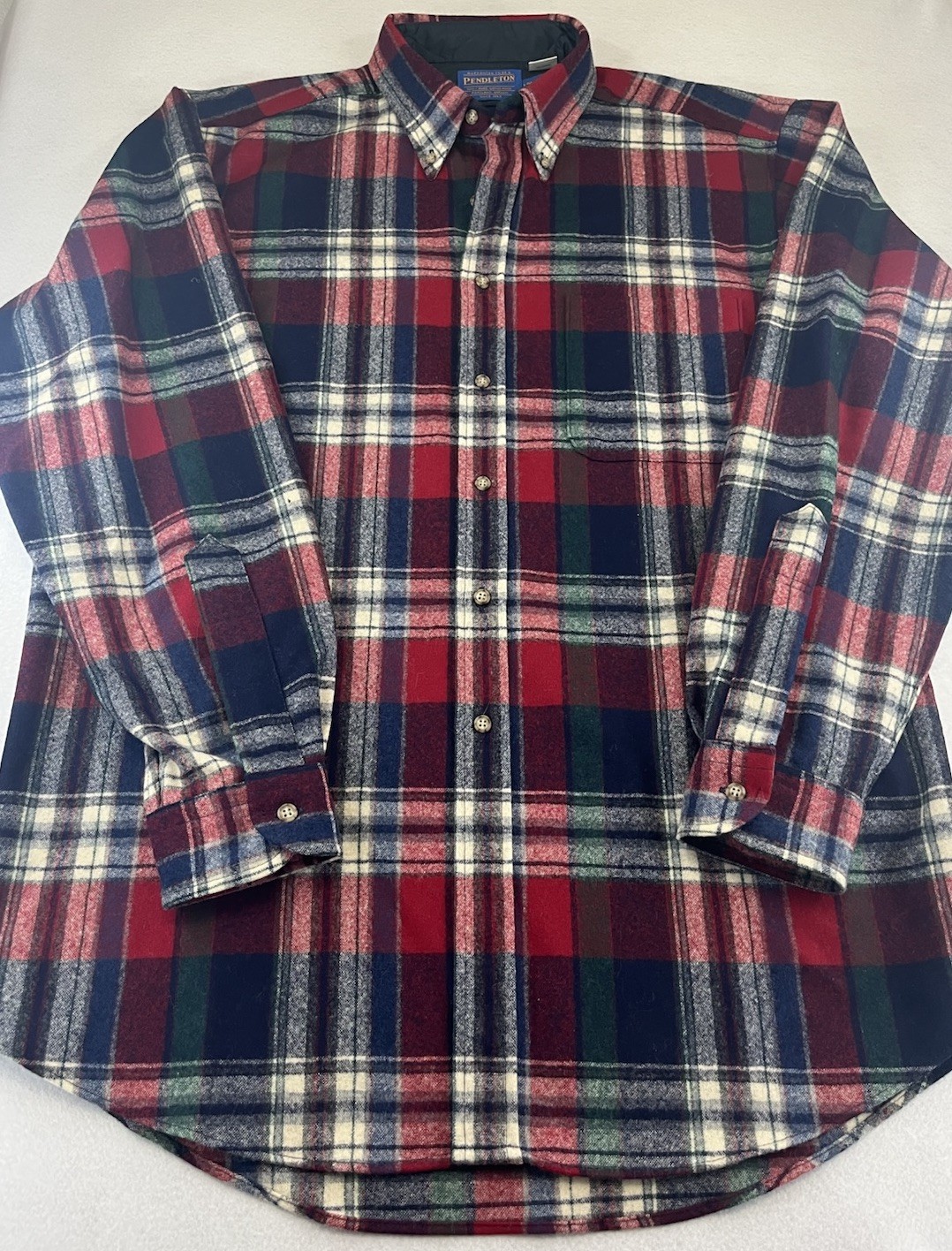 Pendleton 100 Virgin Wool Red Blue Plaid Shirt Mens Size L Long, Made in USA