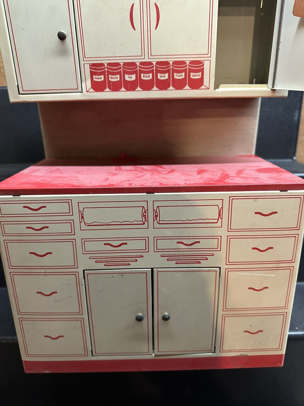 Vintage 50s Wolverine Tin Litho Red White Play Kitchen Cabinet NOS old stock