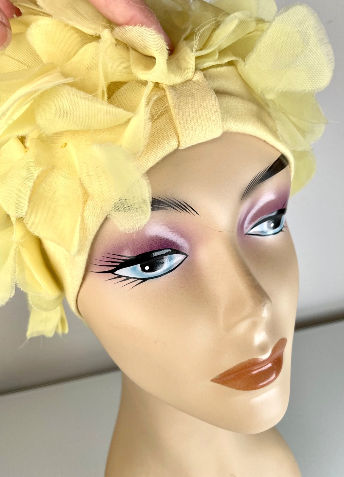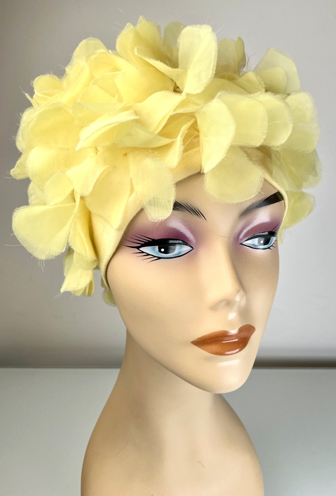 как выглядит Authentic 1960s Vintage Butter Yellow Stretch fabric chiffon floral turban o/s фото