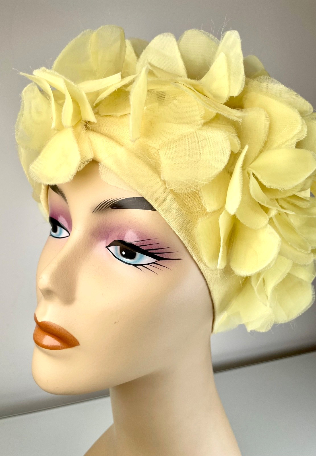 Authentic 1960's Vintage Butter Yellow Stretch fabric chiffon floral turban o/s