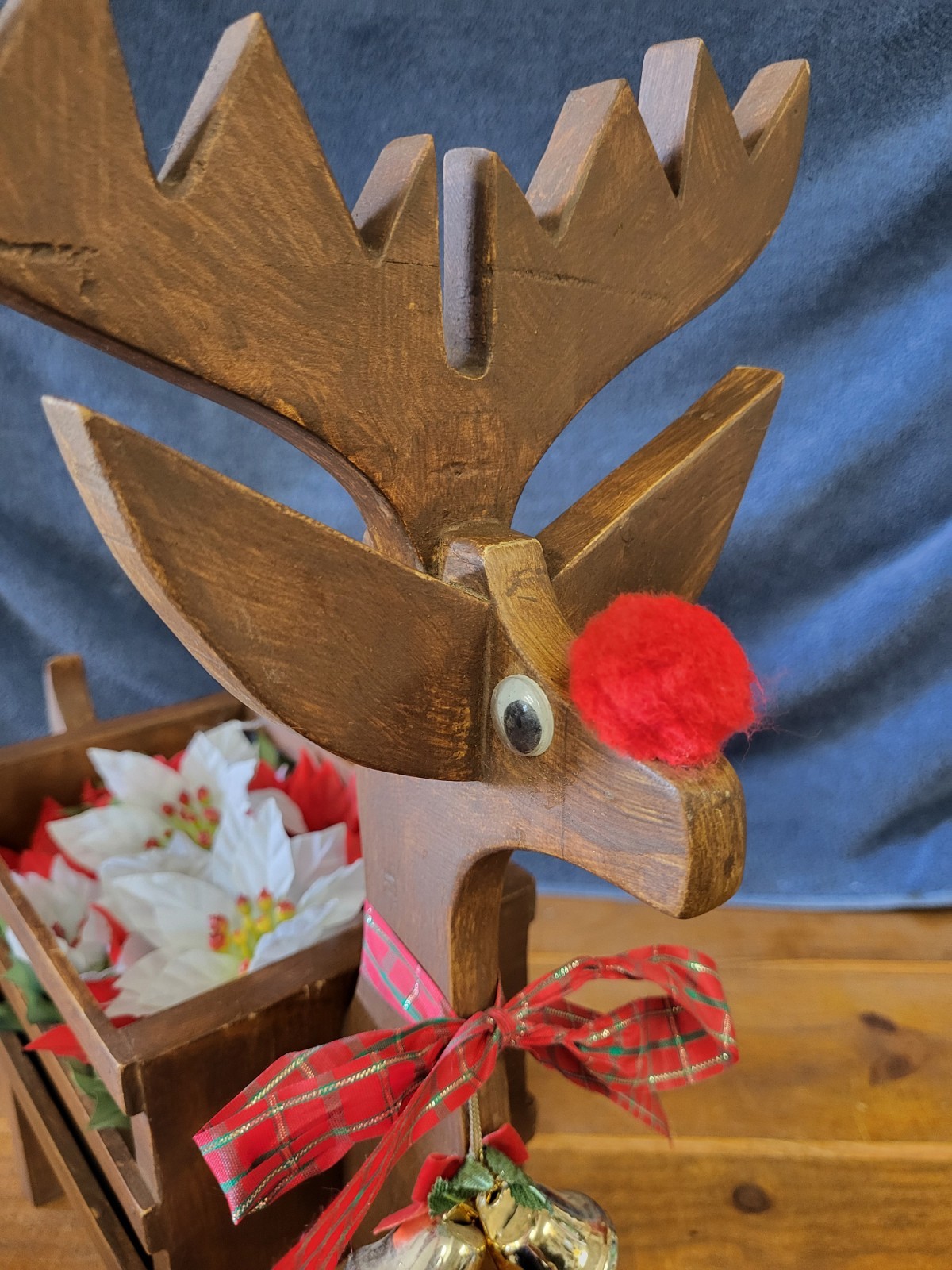 Large Reindeer Wood Hand Cut Vintage 17 Tall x 12 Wide With Bells Ribbons