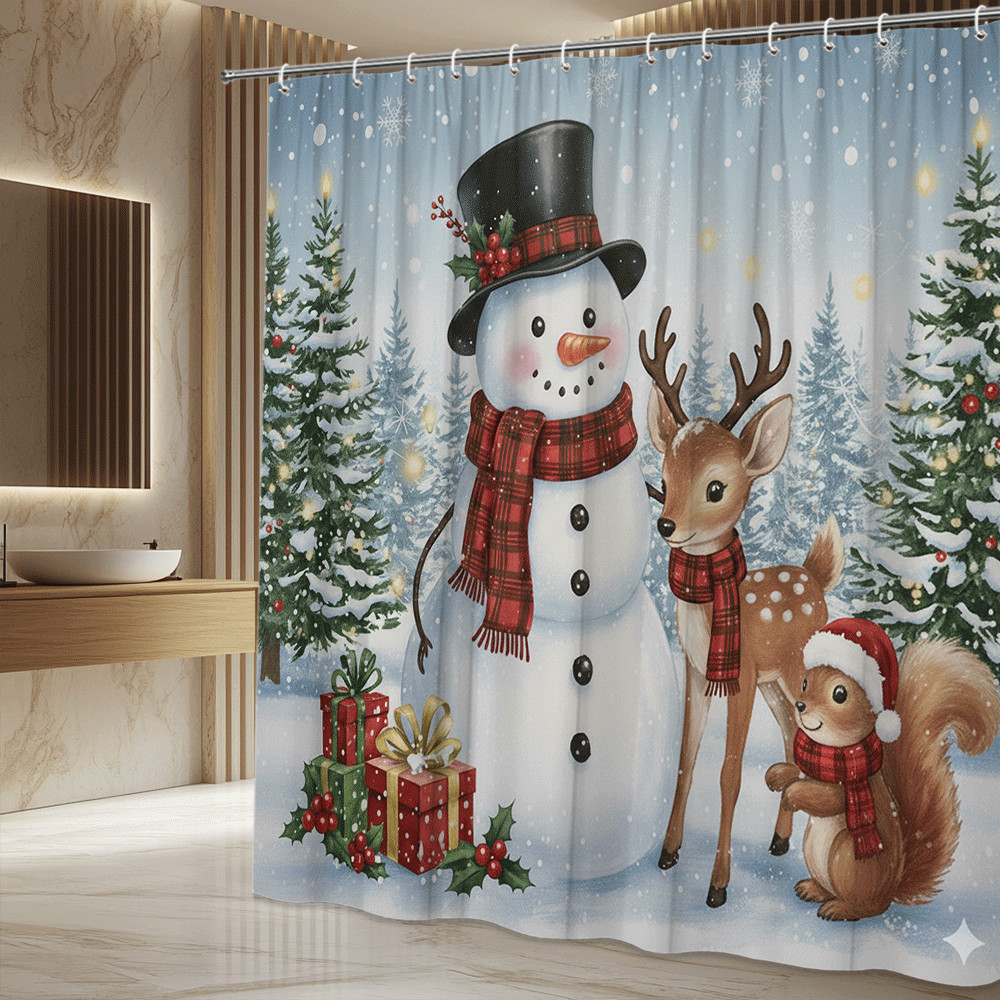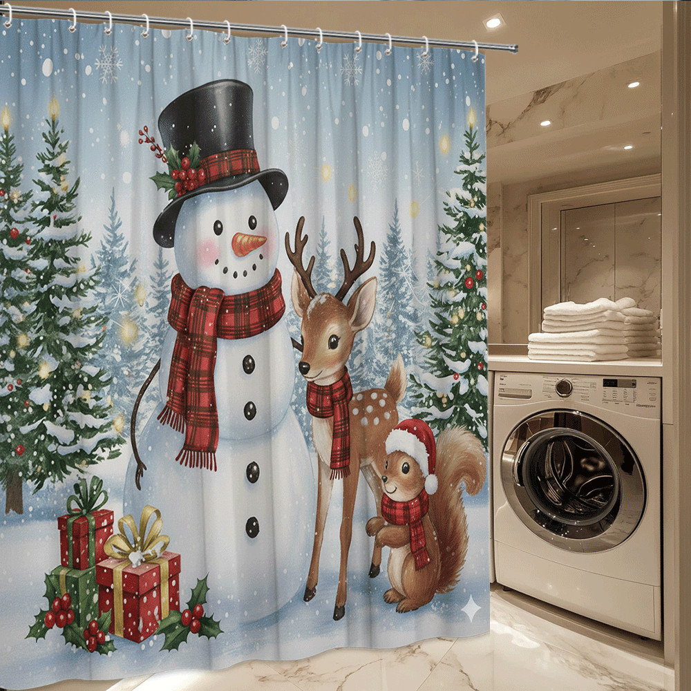 как выглядит Snowman Deer Squirrel Winter Forest Cute Christmas Holiday Art Shower Curtain фото