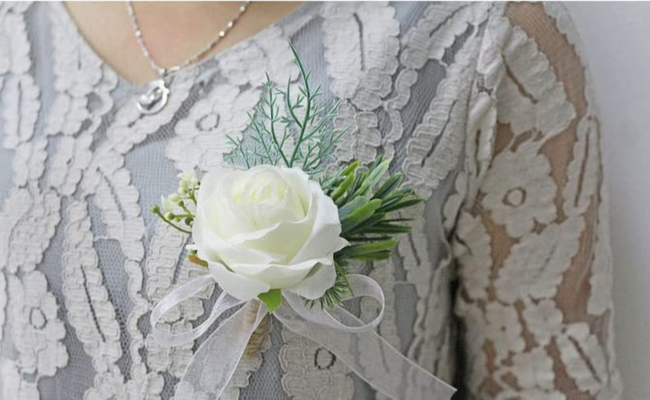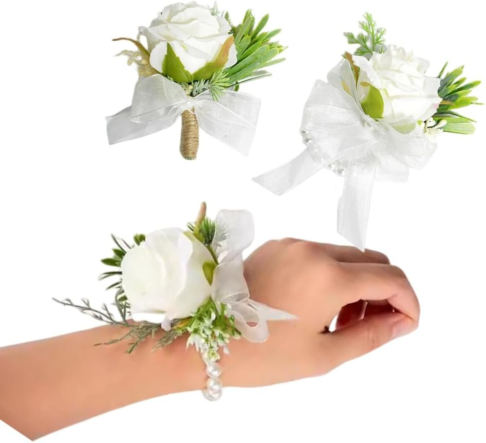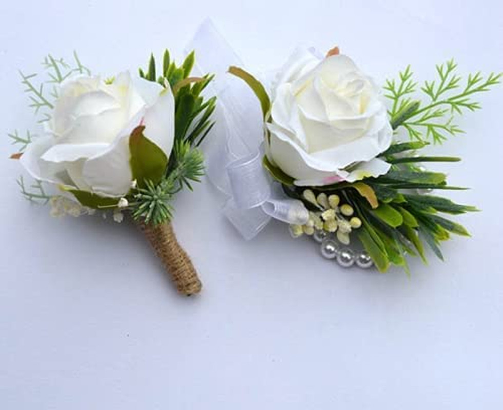2Pcs White Rose Flower Wrist Corsage Boutonniere Set,3 White Corsage and Bouton