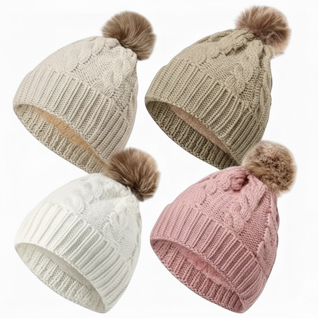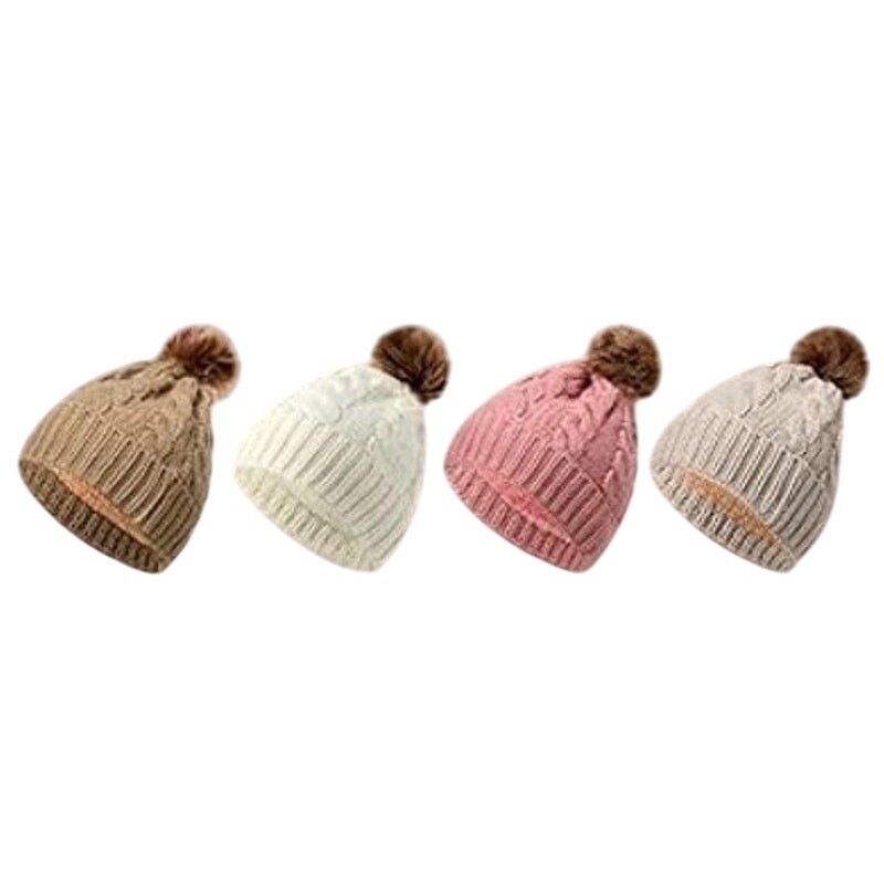 Adult Beanie Winter Cable Knit Faux Fur Pom Unisex Hats Beige Ivory Pink Brown
