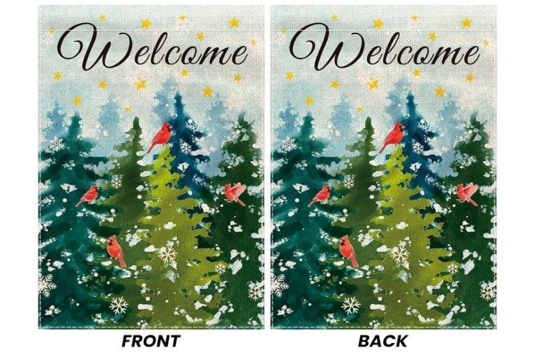 как выглядит Welcome Holiday Garden Flag Cardinals Winter Trees Double Sided Burlap 12"x18" фото