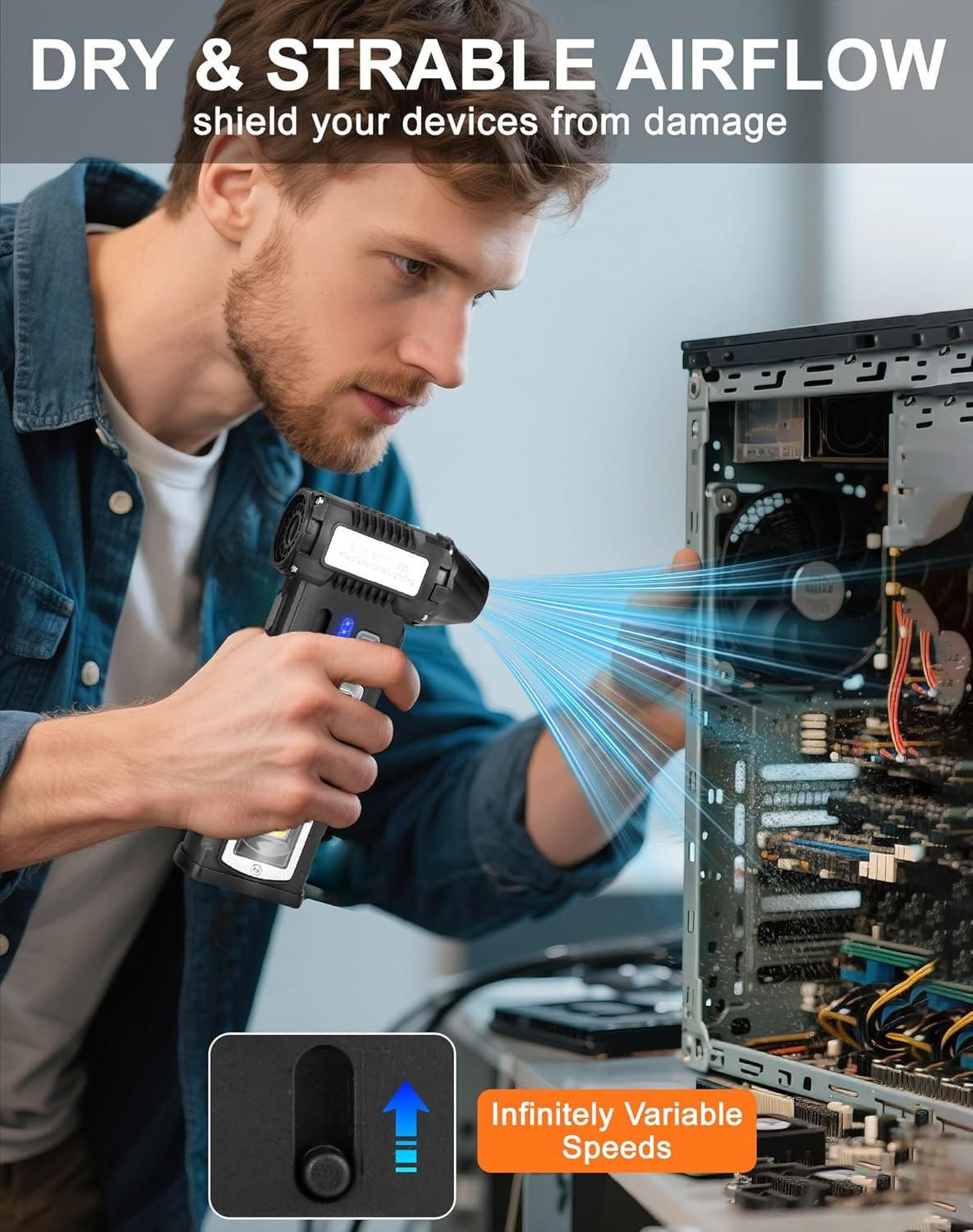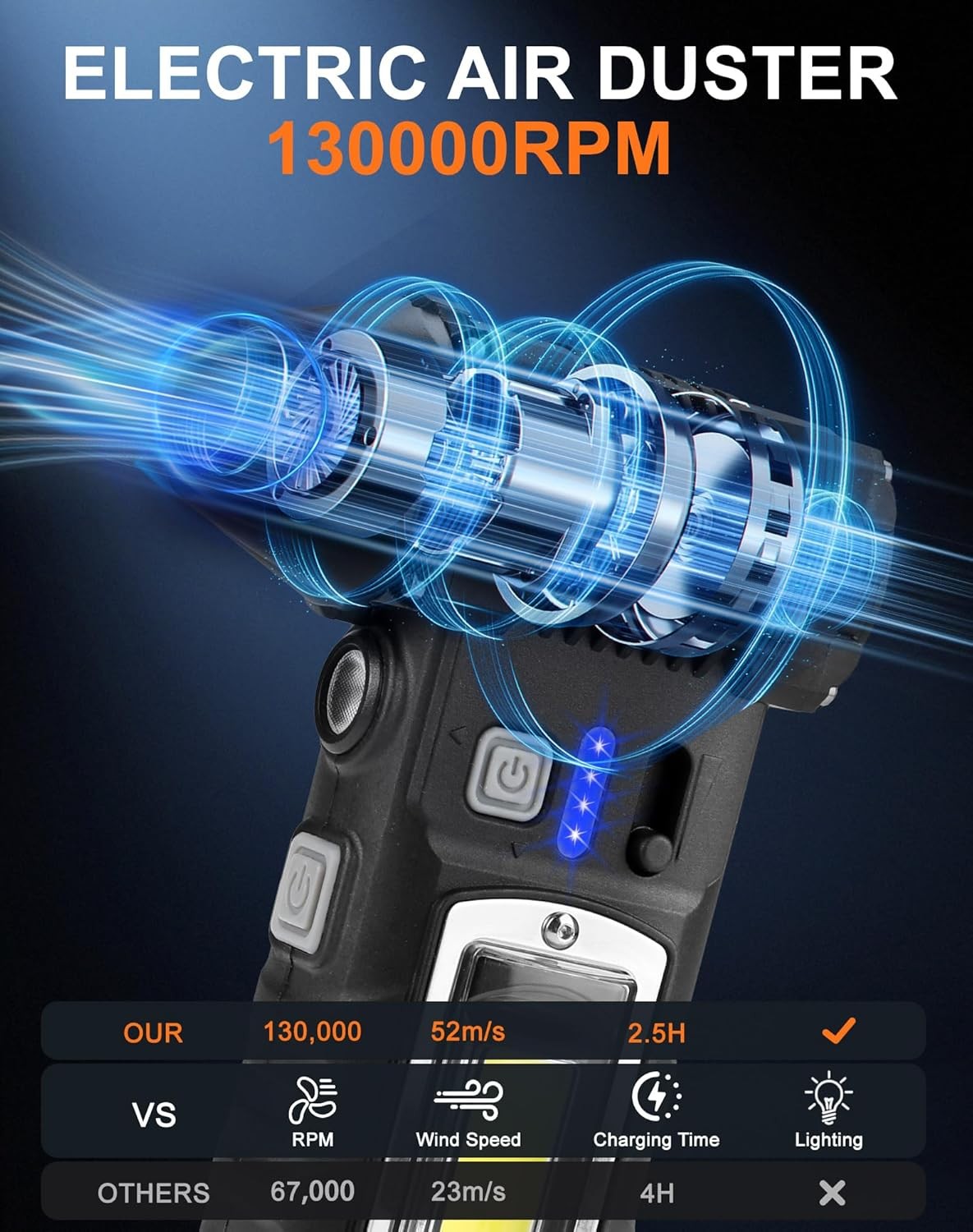 BRIGHT LED ILLUMINATION: This electric air duster features both a built-in LED main light