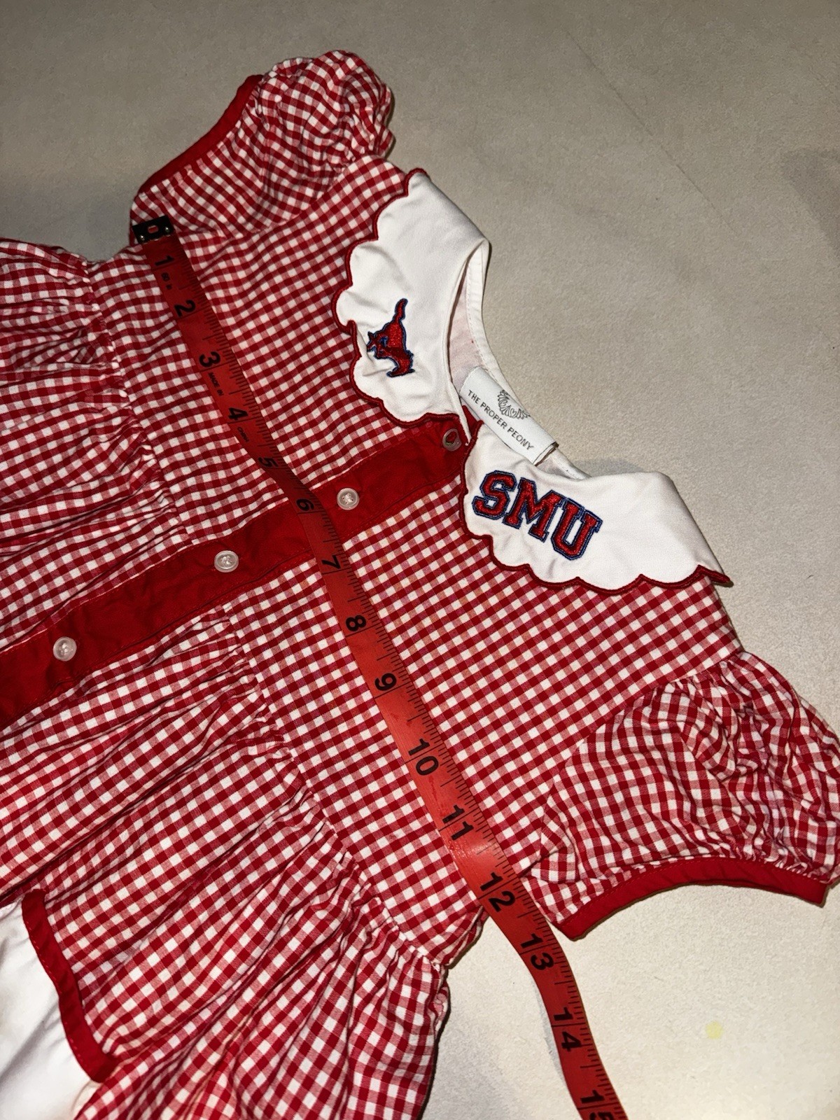 как выглядит The Proper Peony SMU Mustangs Kids Gingham Dress 3T Red White Embroidered фото