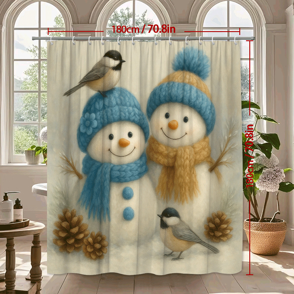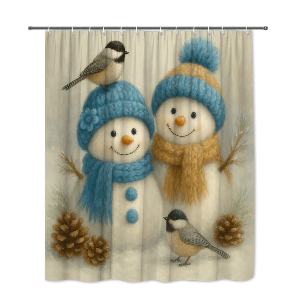 Cute Winter Snowman Shower Curtain with Birds and Pinecones