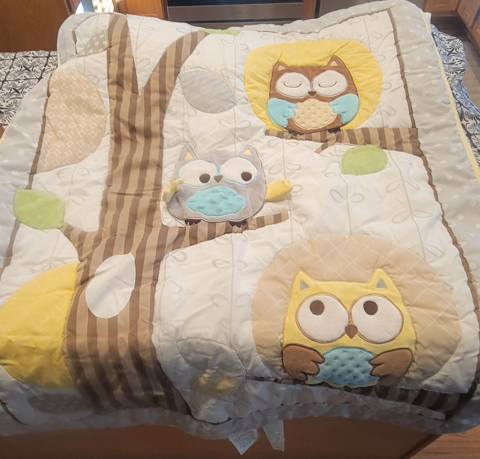 Cute Carters Owl Baby Bedding set; receiving blankets, comforter, diaper storage