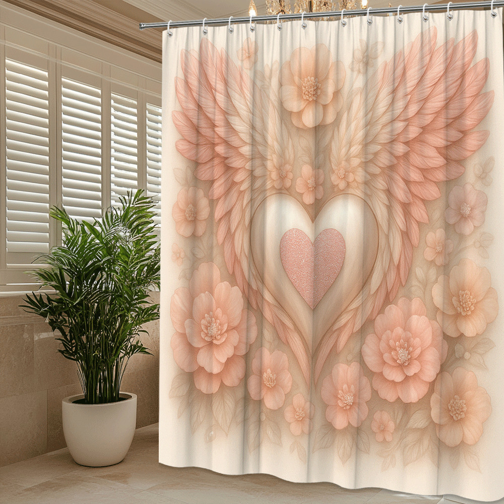 Cute Pink Floral Shower Curtain with Wings and Heart Design