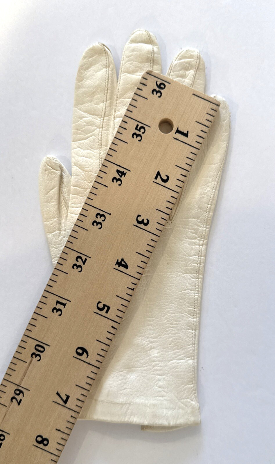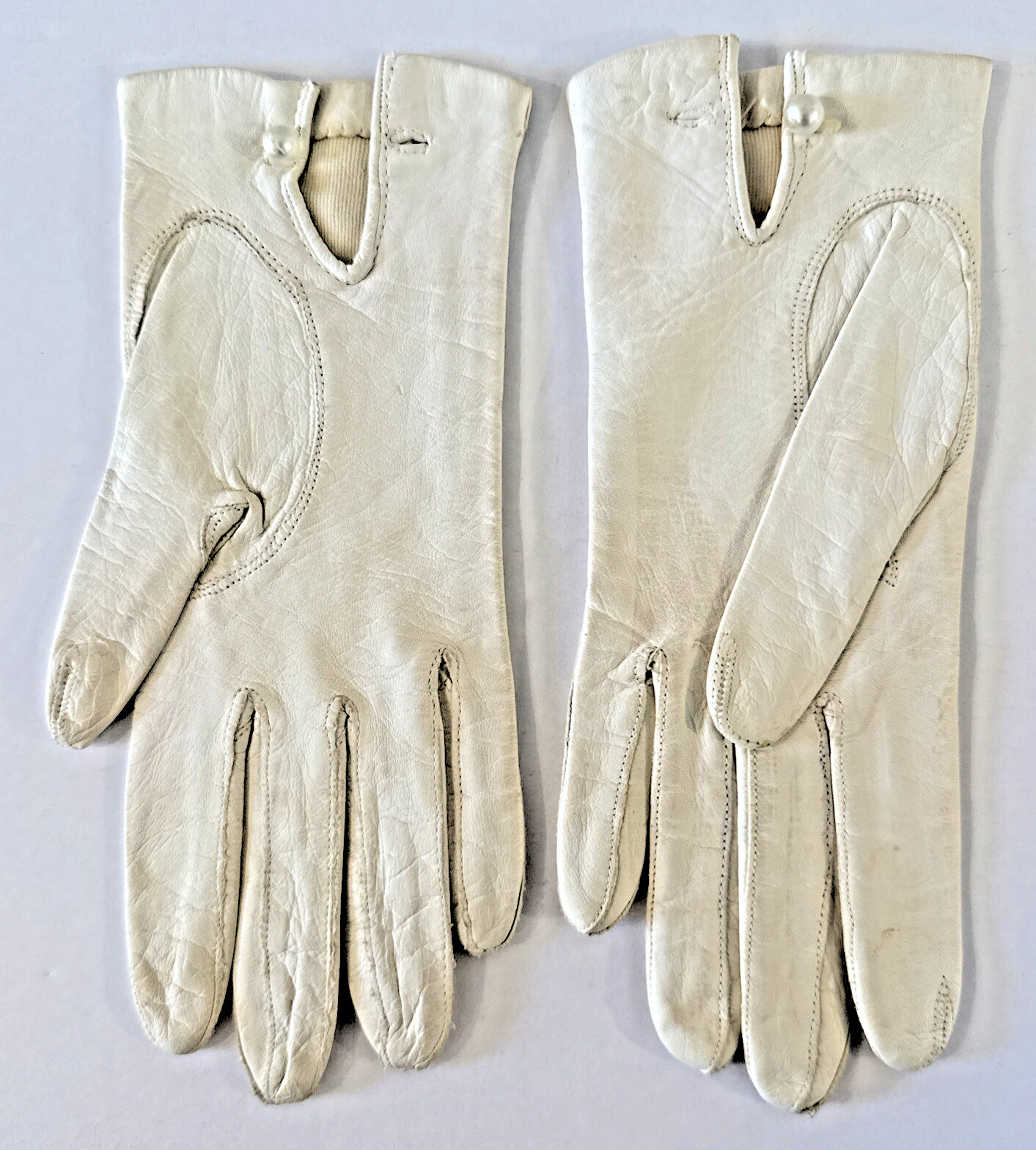 White Lambskin Vintage Leather Gloves Pearl Button Lined Small Wrist Length