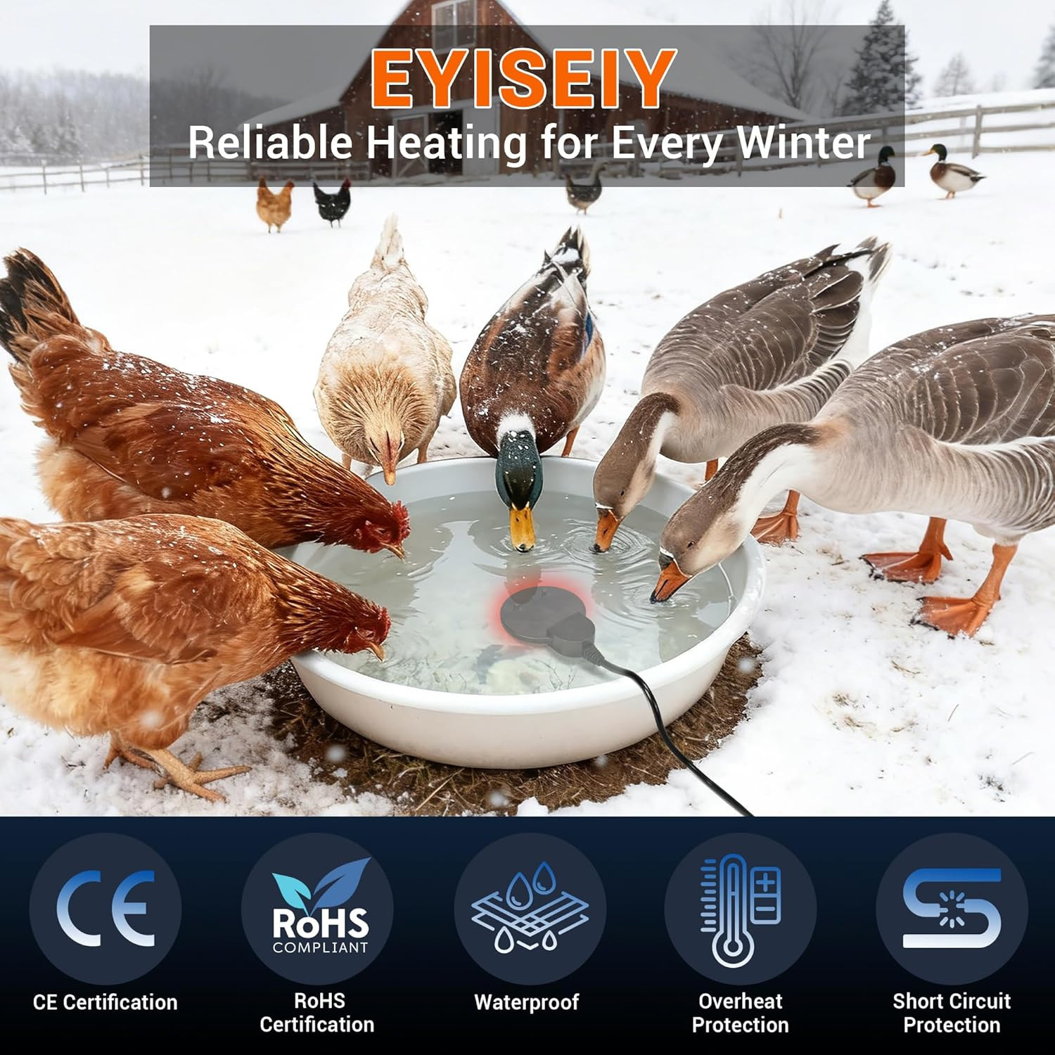 Chicken Water Heater for Winter with Immersion Design, Bird Bath Livestock De-
