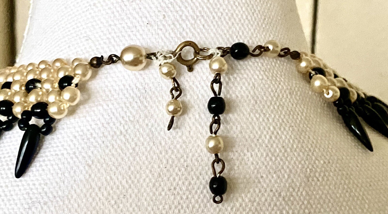 как выглядит VINTAGE FAUX PEARL, BLACK ONYX GLASS COLLAR CHOKER NECKLACE HAND BEADED фото