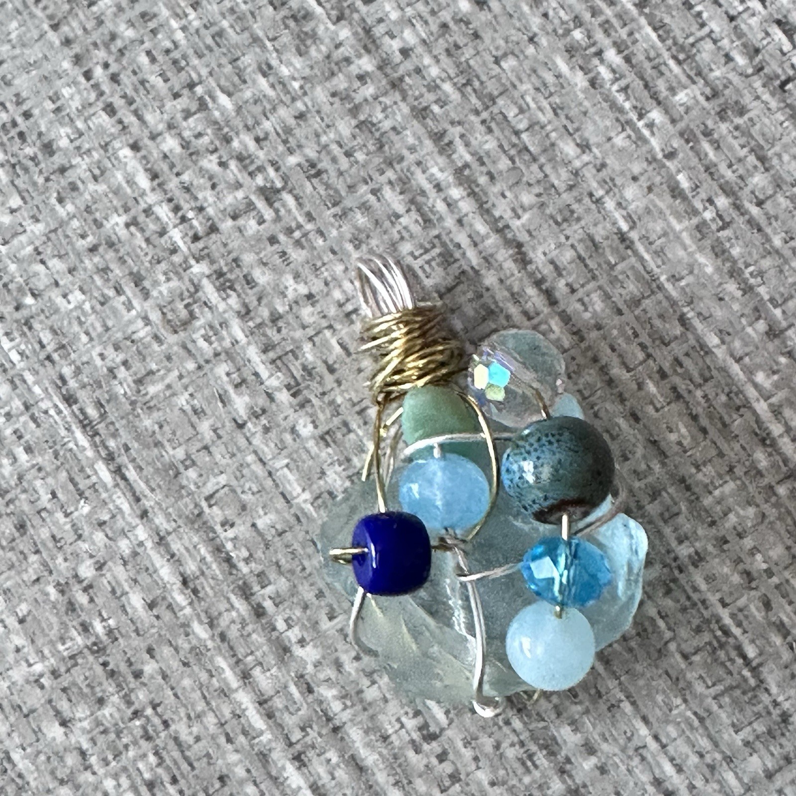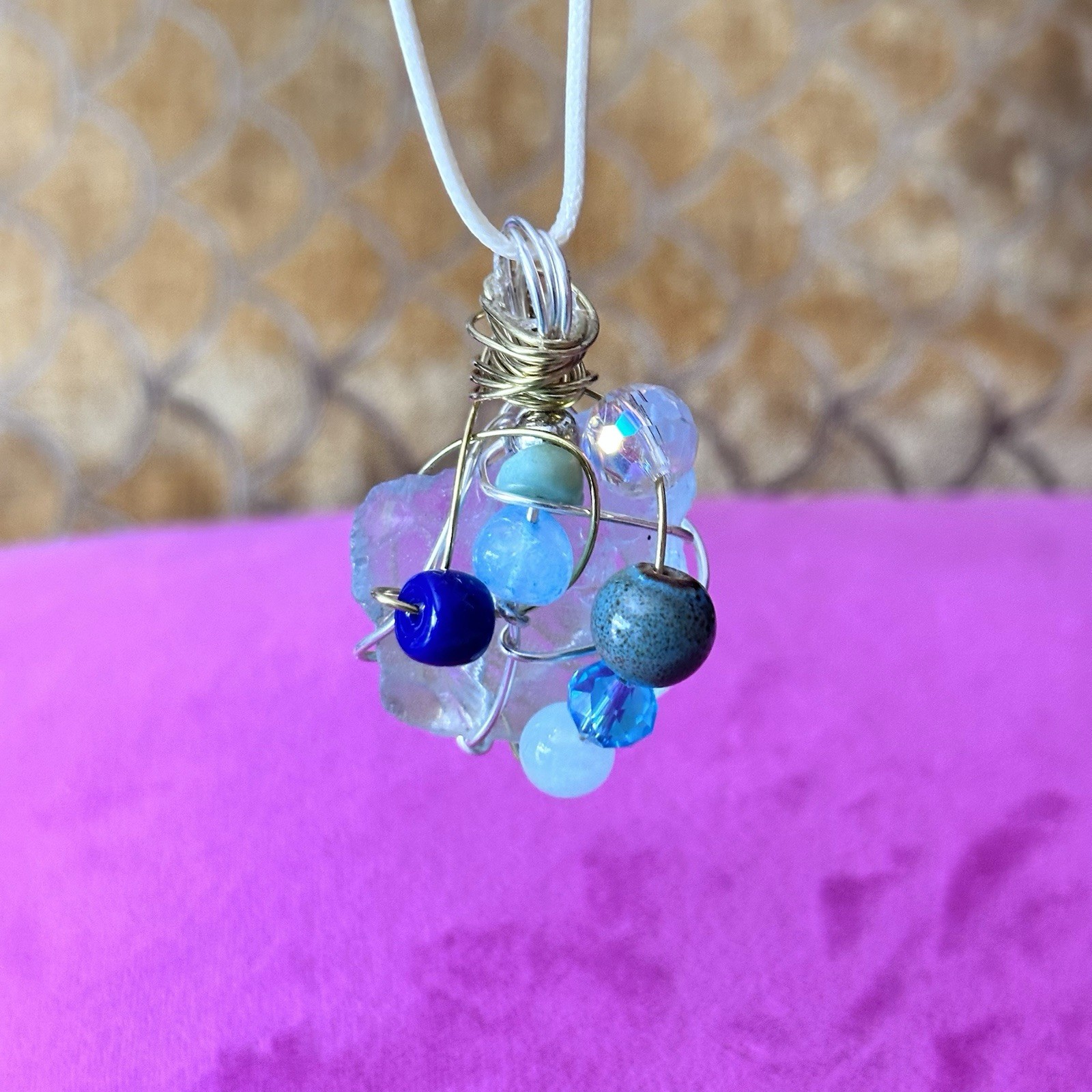 Sea Beach Glass Pendant Necklace Aqua Color Wire Wrapped Beads Handmade 3410 B