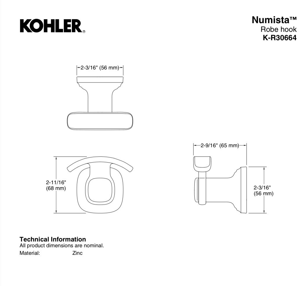 Kohler Numista Robe Hook In Polished Chrome, New In Box Reg 20 - 3 Available