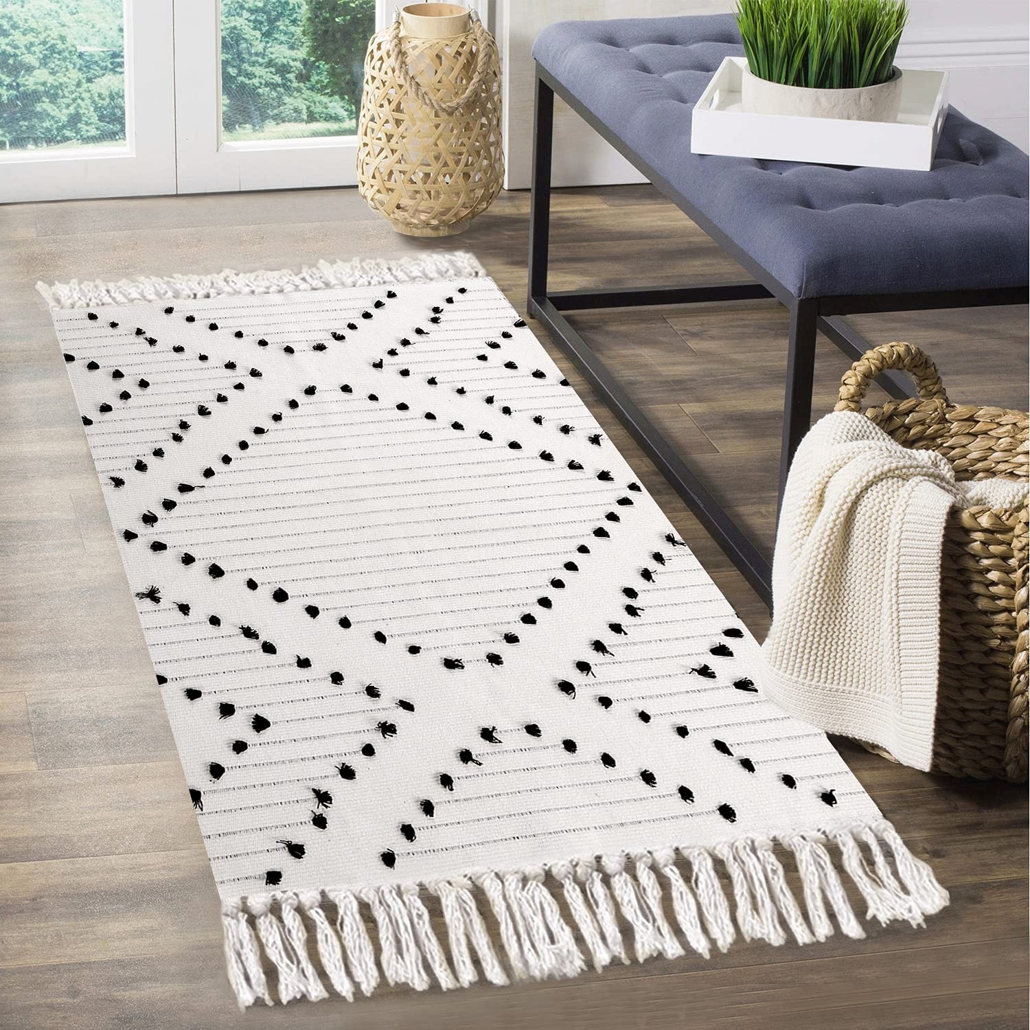 Boho Bathroom Runner Rug 2 X 4.3 , Washable Woven Cotton Diamond Area Rug,Bl...