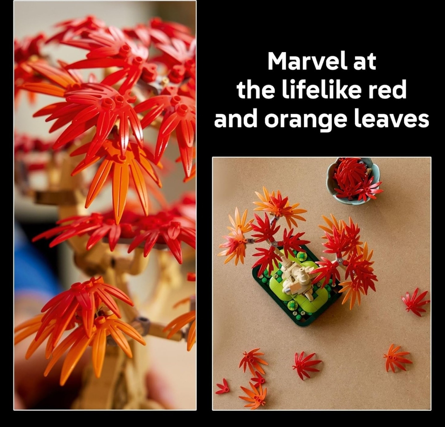 Особенности: Features gorgeous red- and amber-colored leaves, The LEGO tree comes with a dark green pot for easy display, Once complete, use the bonsai tree as nature home decor