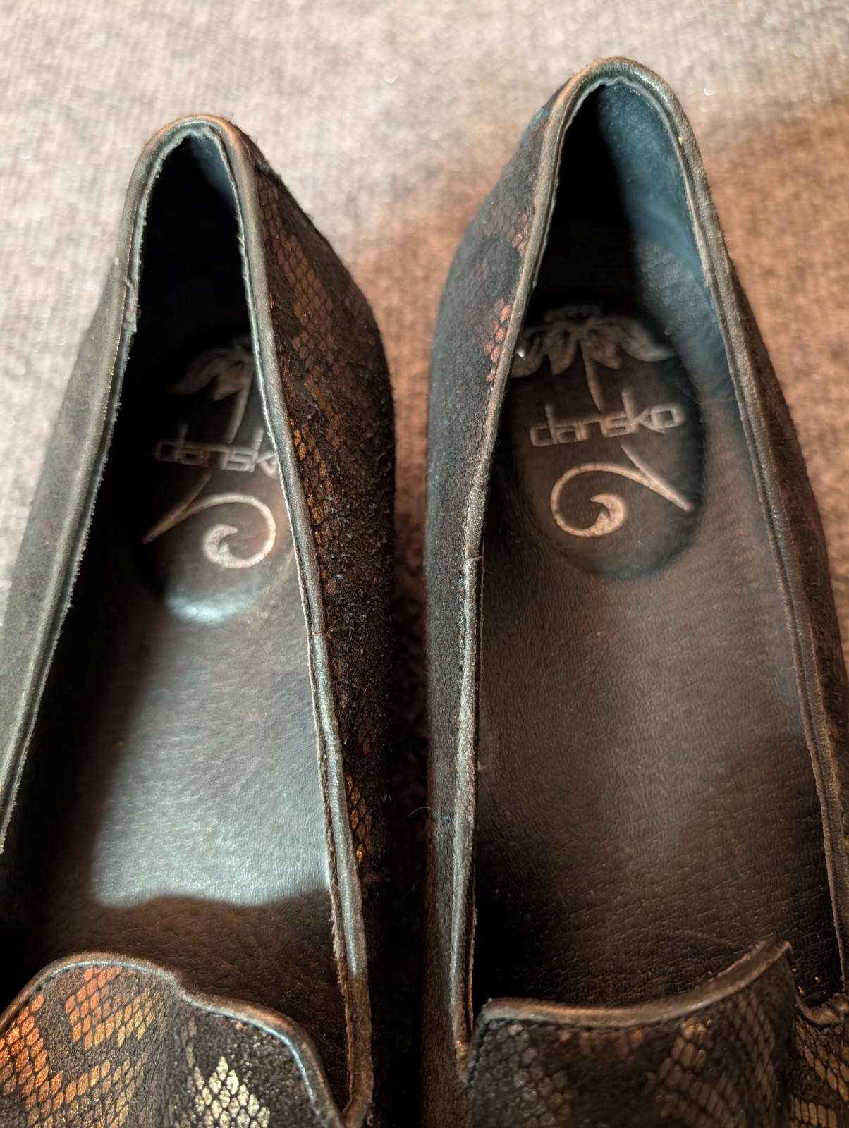 Dansko Black Gold Snake Print Leather Slip On Loafers Shoes Women's Sz 7.5 38