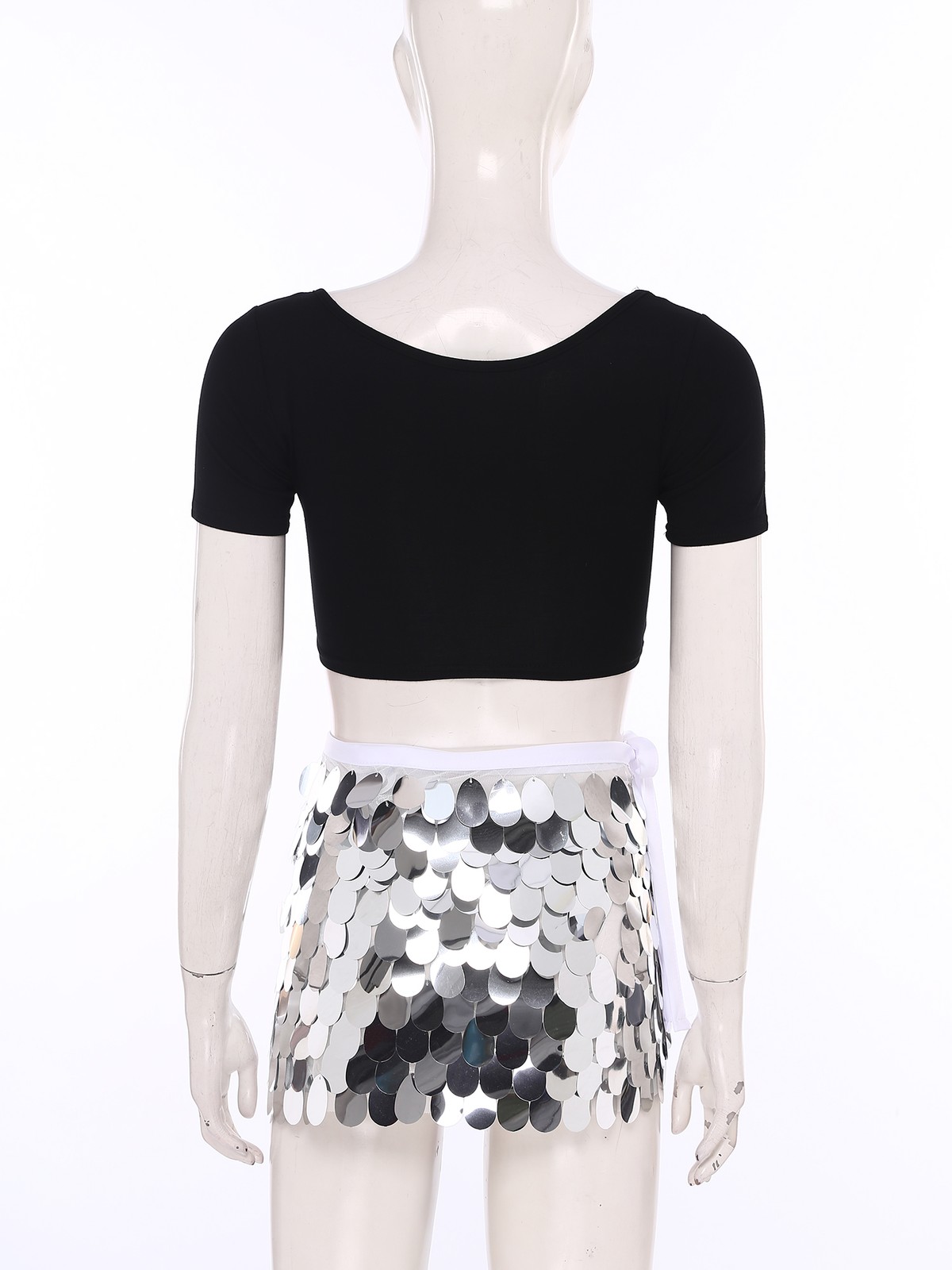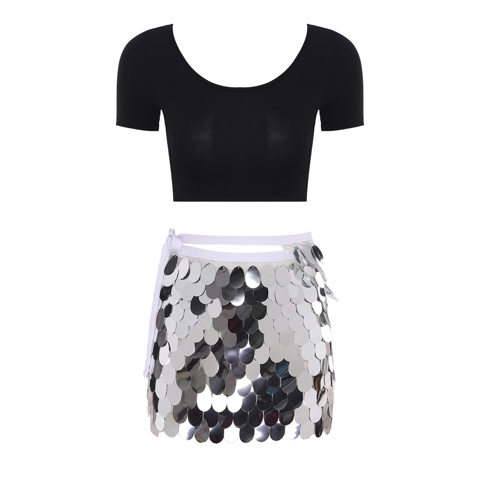 Womens Dancewear Hip Scarf Set Sequin Costume Short Sleeve Outfit Stage Dance
