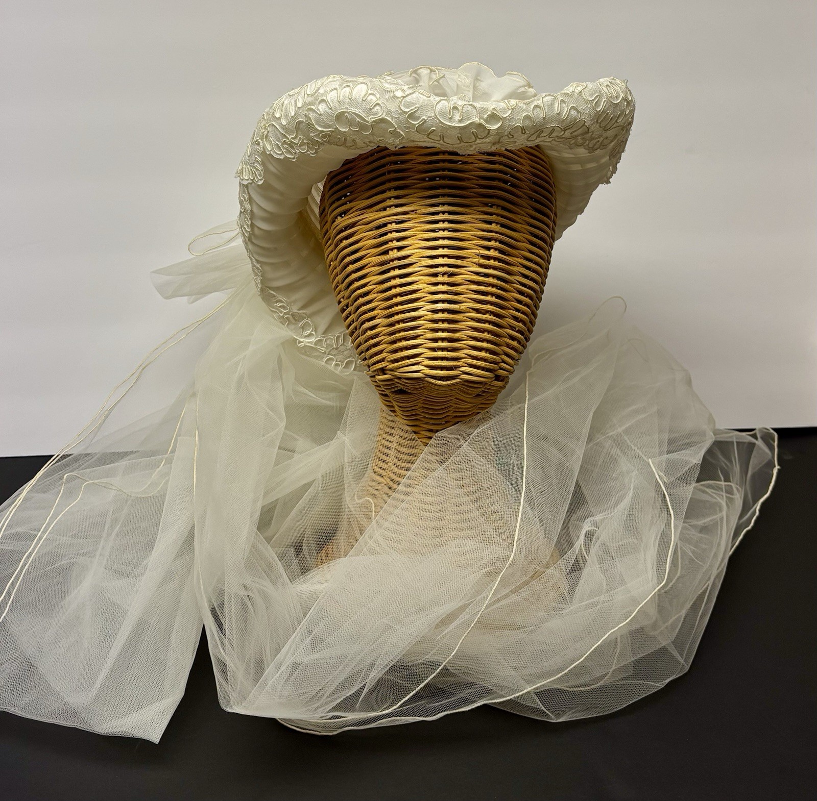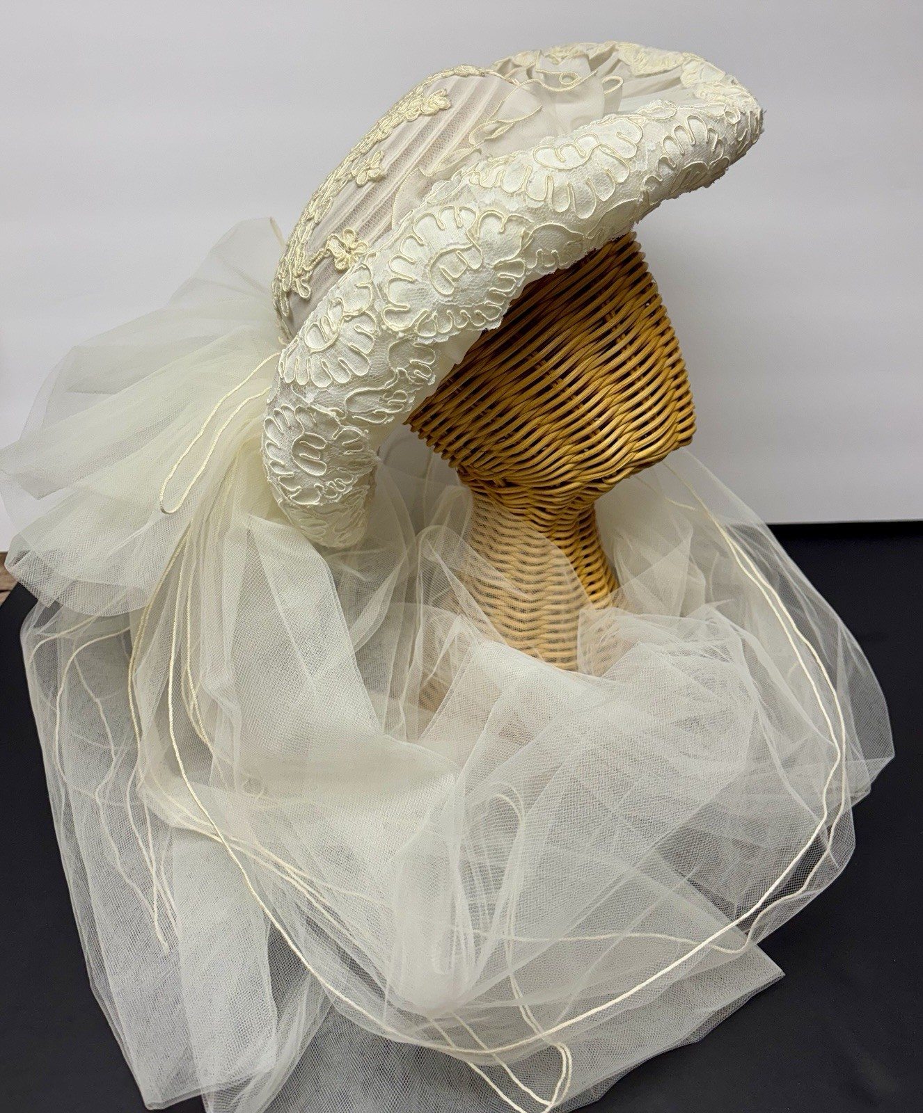 VTG 80s Ivory Lace Bridal Hat Tulle Veil Wedding Headpiece Retro Bachelorette Sm