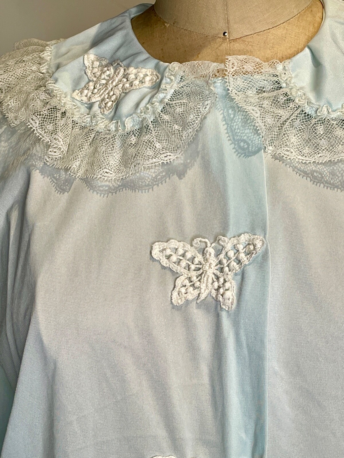 как выглядит VTG 60S STELLA FAGIN BLUE NYLON LACE BUTTERFLY TRIM PJ PAJAMA TOP BED JACKET S фото