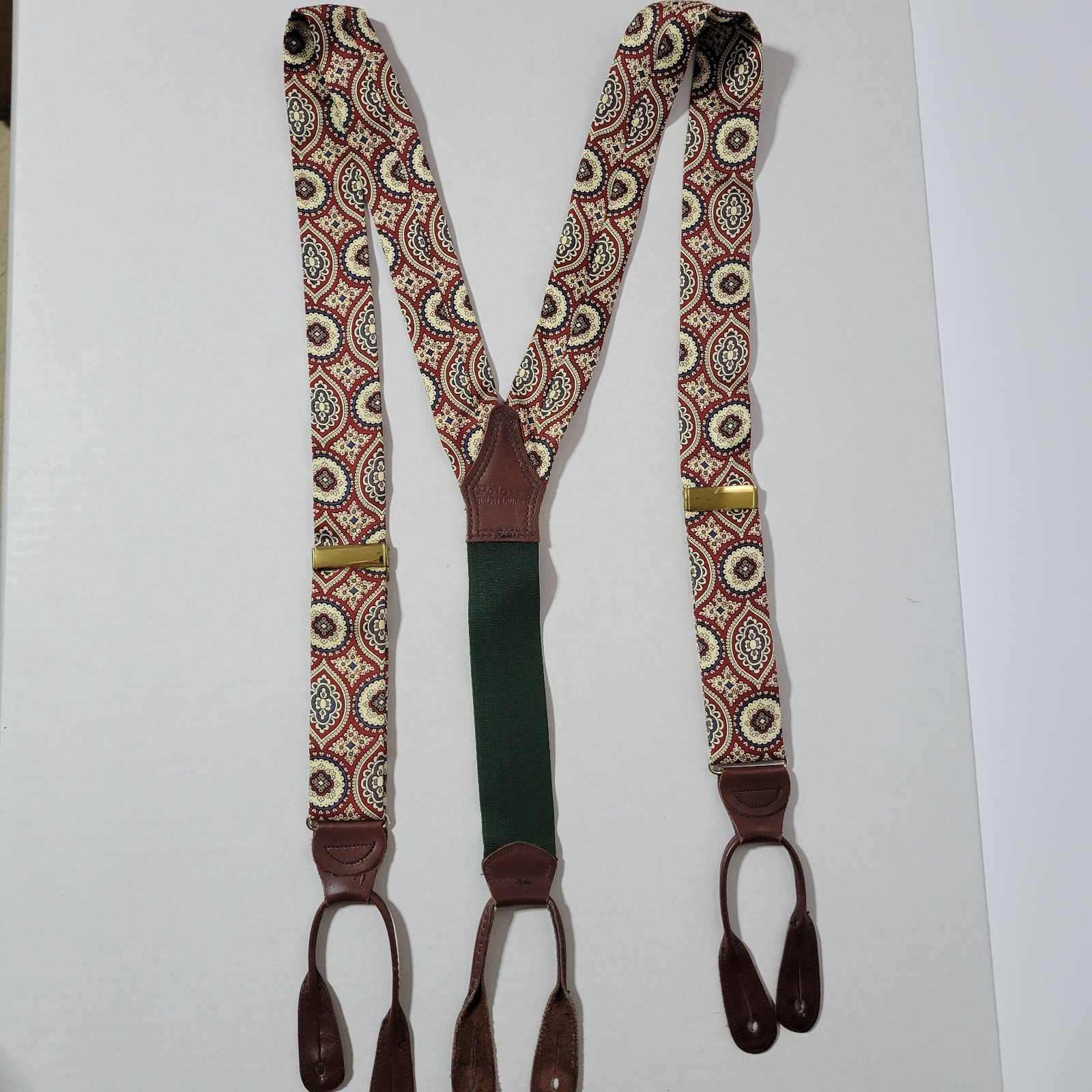 VTG Polo Ralph Lauren Medallion Graphic Silk Leather Brass Suspenders