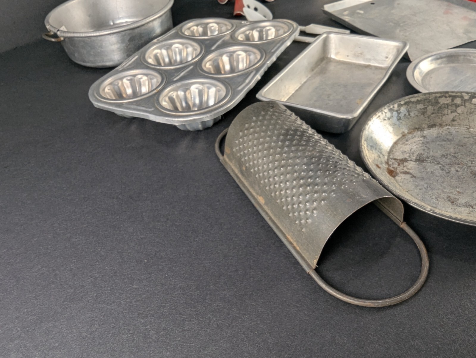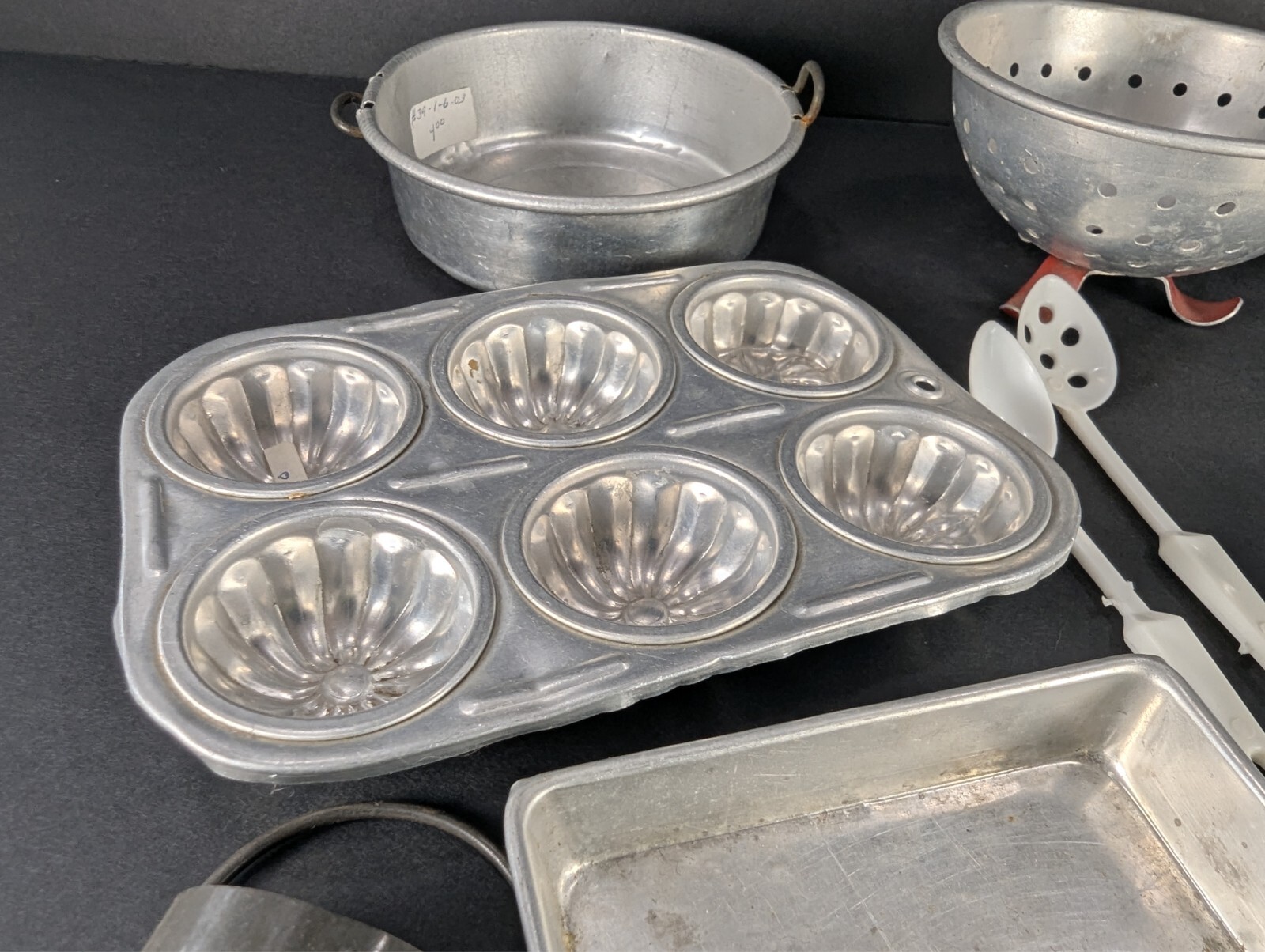 как выглядит Vintage Lot Childrens Play Kitchen Pots Pans Bakeware Toys Aluminum Tin фото