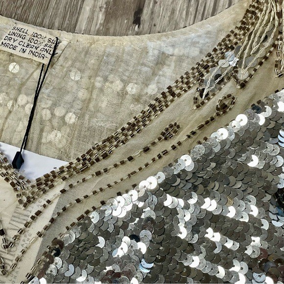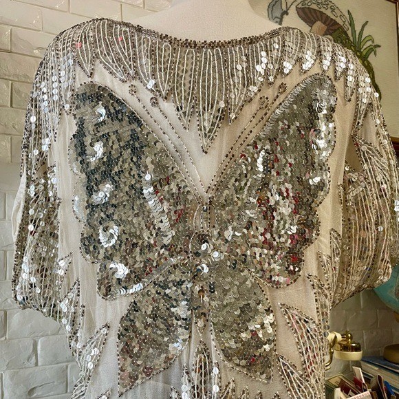 как выглядит Vintage 1970s Metallic Disco 100 Silk Sequin Beaded Butterfly Flowy Top фото