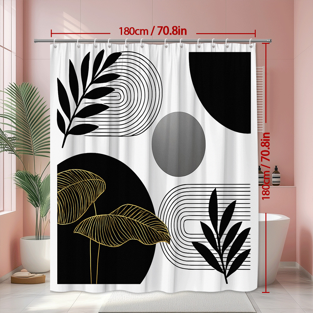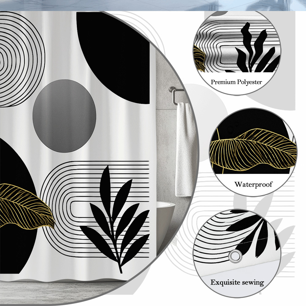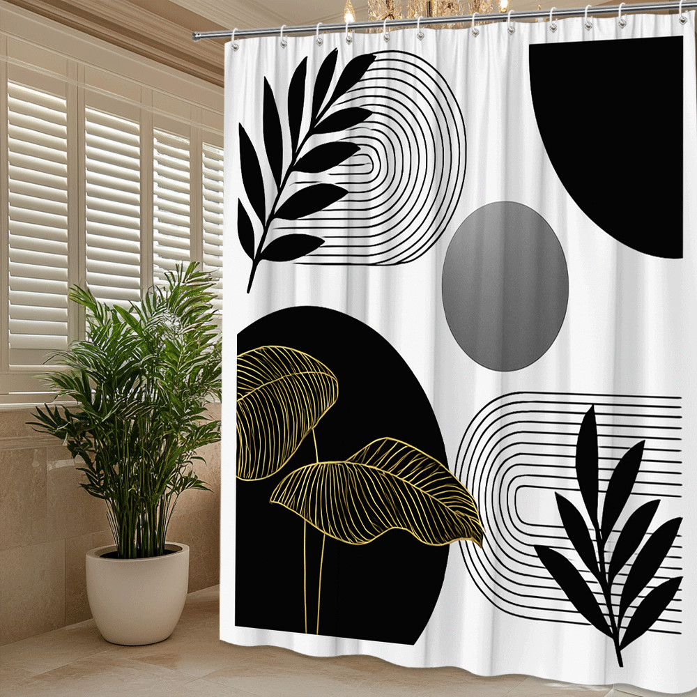 Black and Gold Modern Shower Curtain with Leaf and Geometric Design