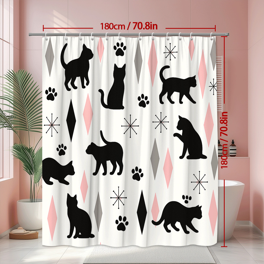 Cute Cat Shower Curtain with Black Silhouettes and Pink Diamonds