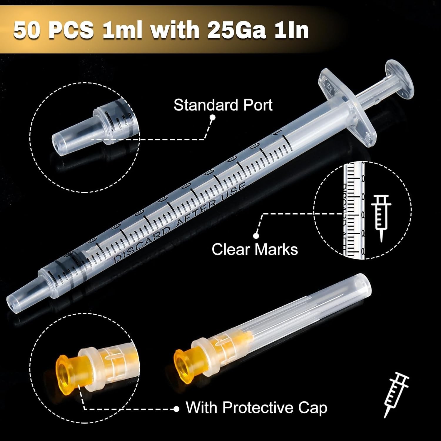 25 Gauge 1 inch Needle with Syringe 50Pack, 1ml Luer Lock Disposable Syringes..