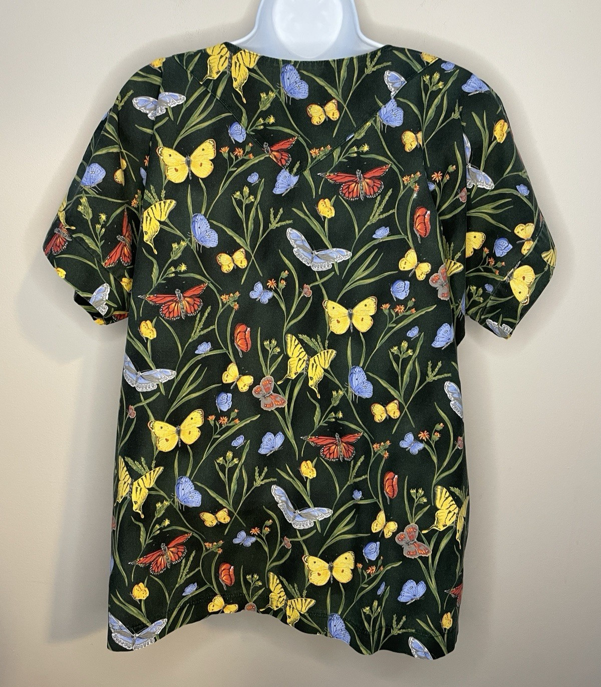 Scrub Med Top Women Medium Butterflies Cotton Pocket Colorful S/S Medical