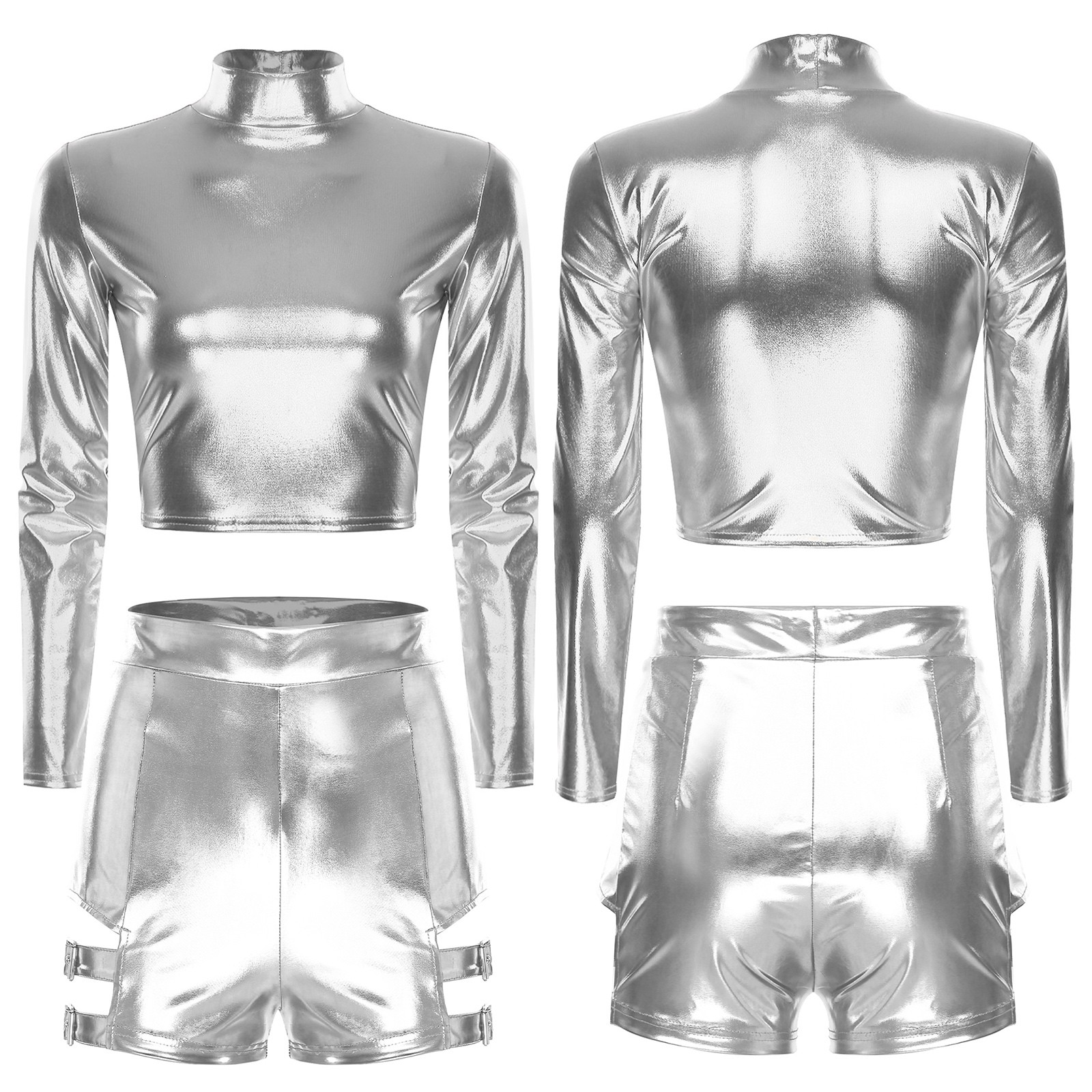 как выглядит Womens Dancewear Musical Sets 2 Piece Outfit Costumes Metallic High Waist Metal фото