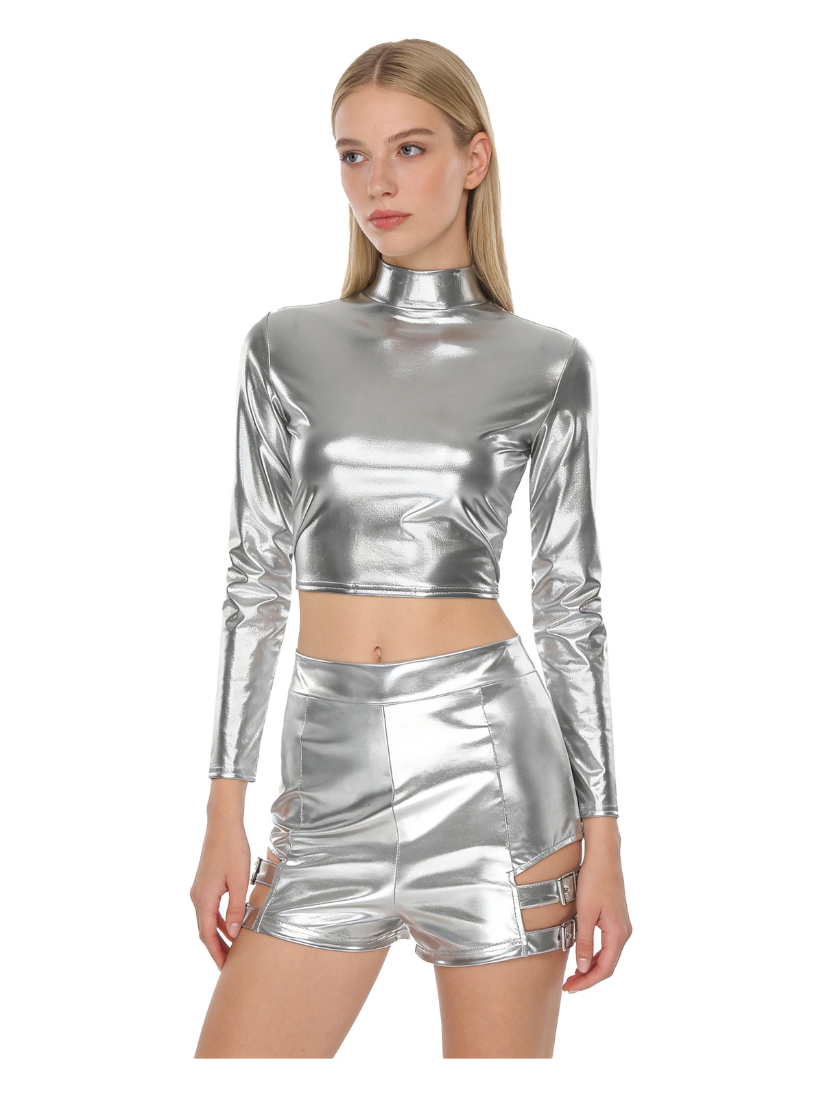Womens Dancewear Musical Sets 2 Piece Outfit Costumes Metallic High Waist Metal