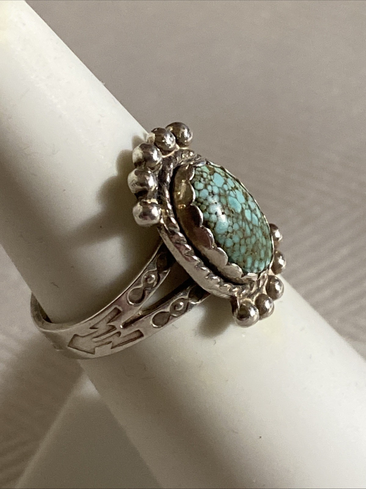 Native American Signed Beautiful Sterling Spiderweb Green Turquoise Ring Size 5