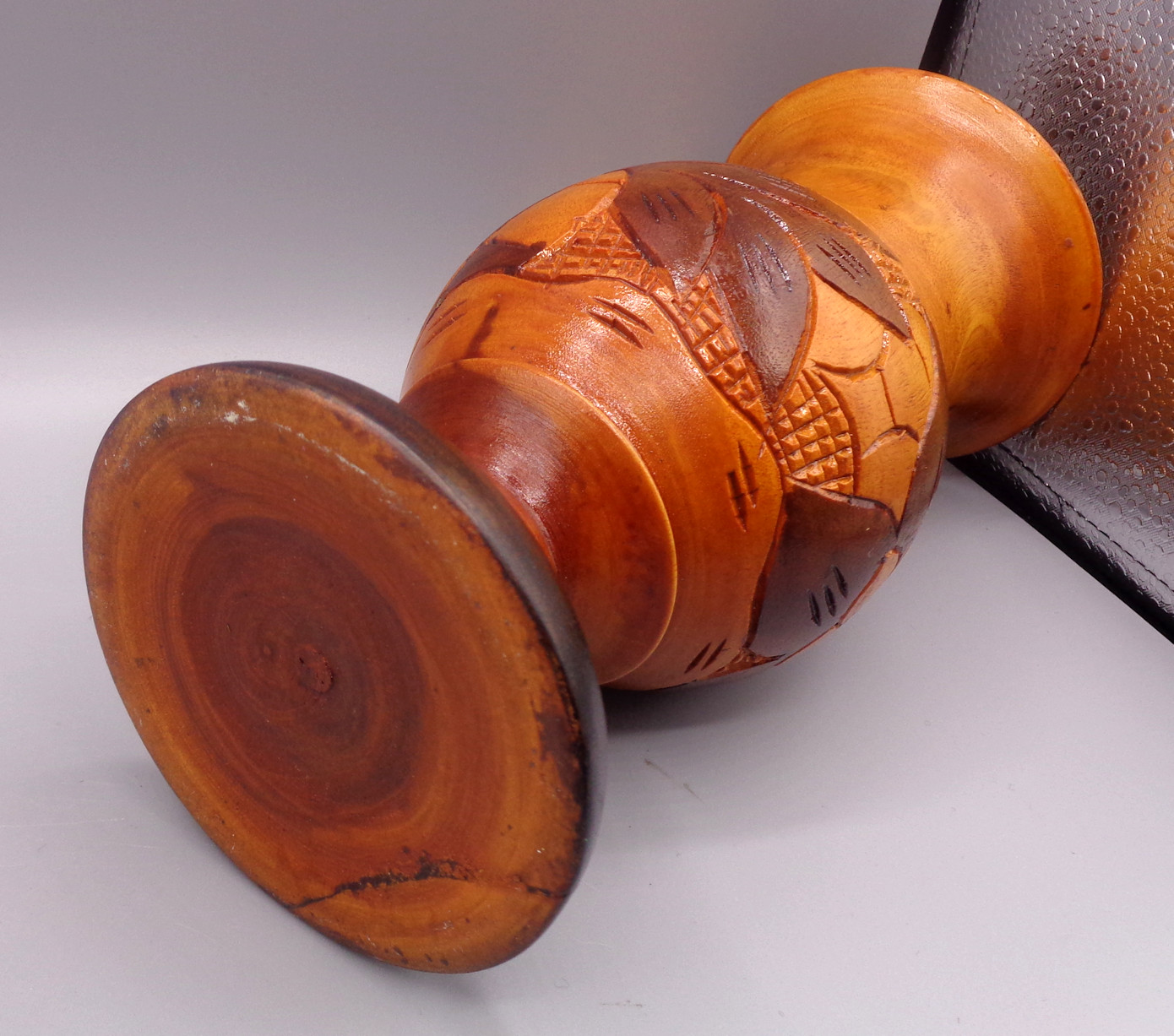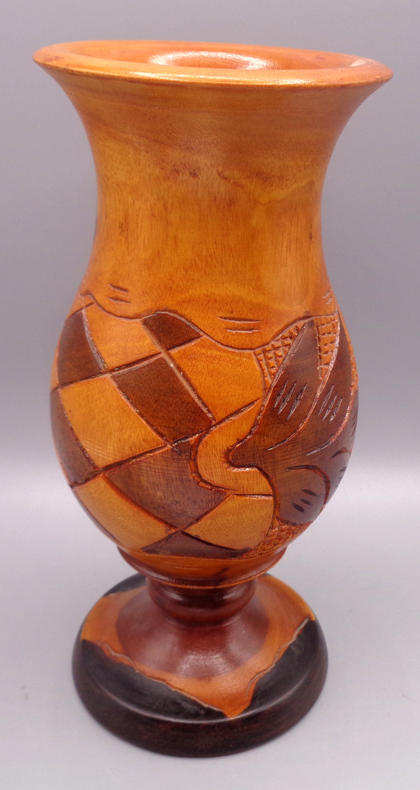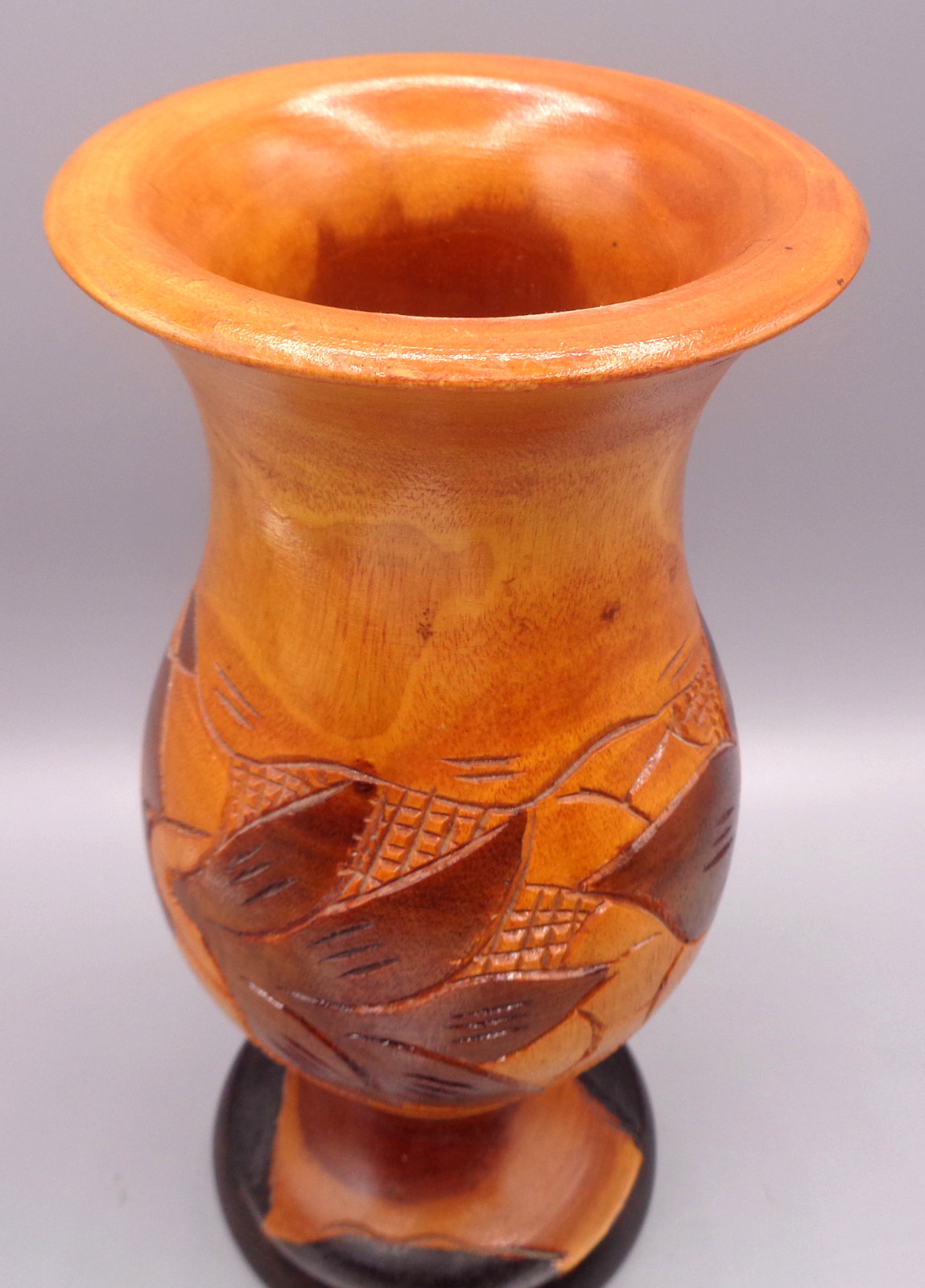 как выглядит Vintage Hand Carved Wood Flower Vase Leaf Detail Two Tone Home Decor Piece Boho фото