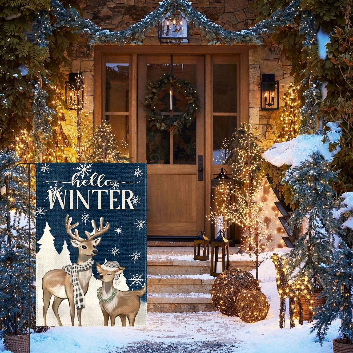 Hello Winter Reindeer Snowflake Garden Flag 12X18 Inch Double Sided Outside, Win