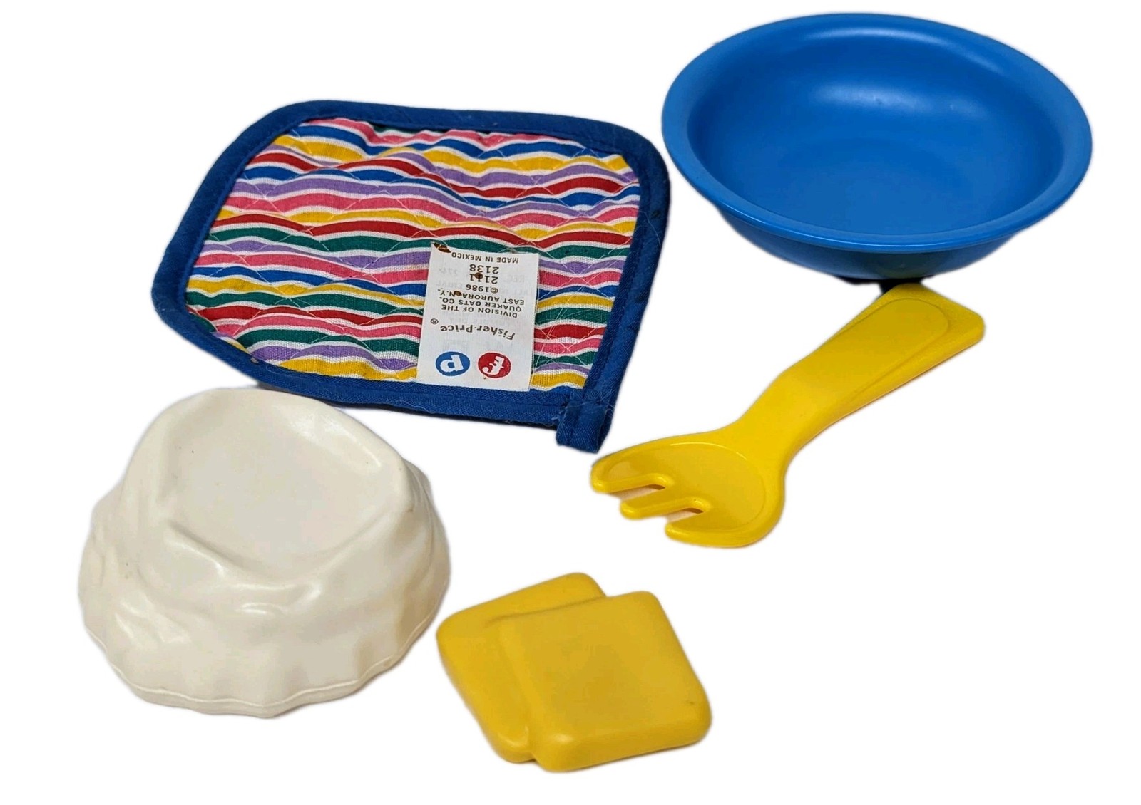 как выглядит FISHER PRICE FOOD WHIPPED MASHED POTATOES BUTTER DISH FORK POTHOLDER PLAY FOOD фото