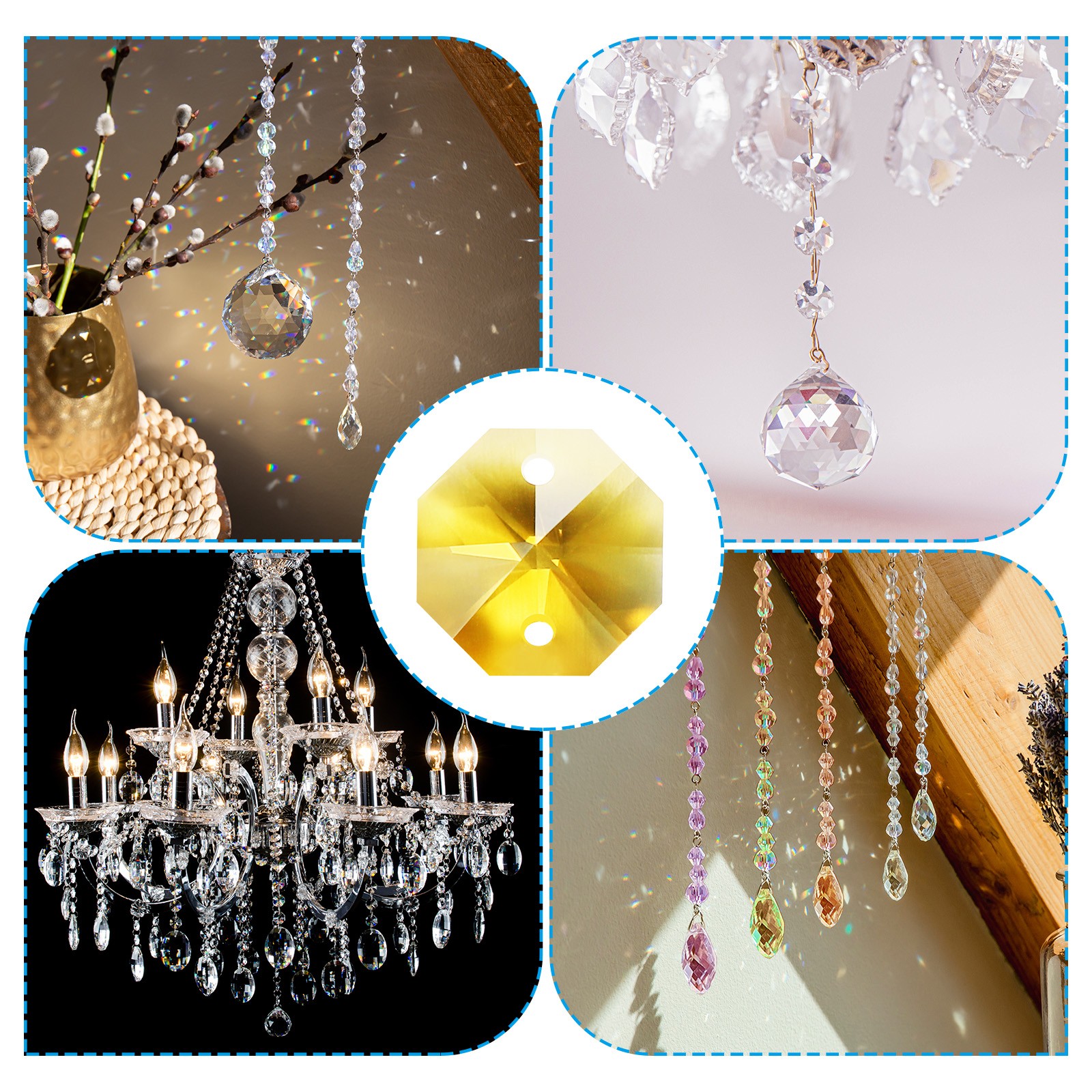 60 Pack K9 Crystal Octagon Beads 2 Holes 14mm Chandelier Prism Golden