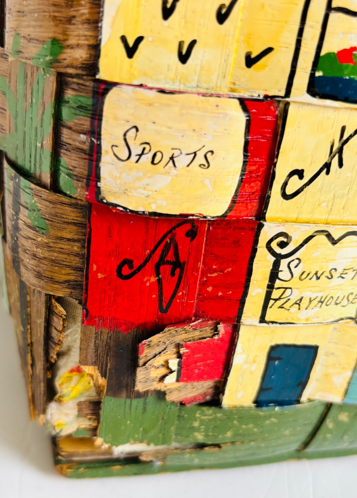 VTG CARO NAN 60'S MOD BOHO WOVEN WOOD BOX BASKET BAG PURSE PAINTED TOWN HAS FLAW