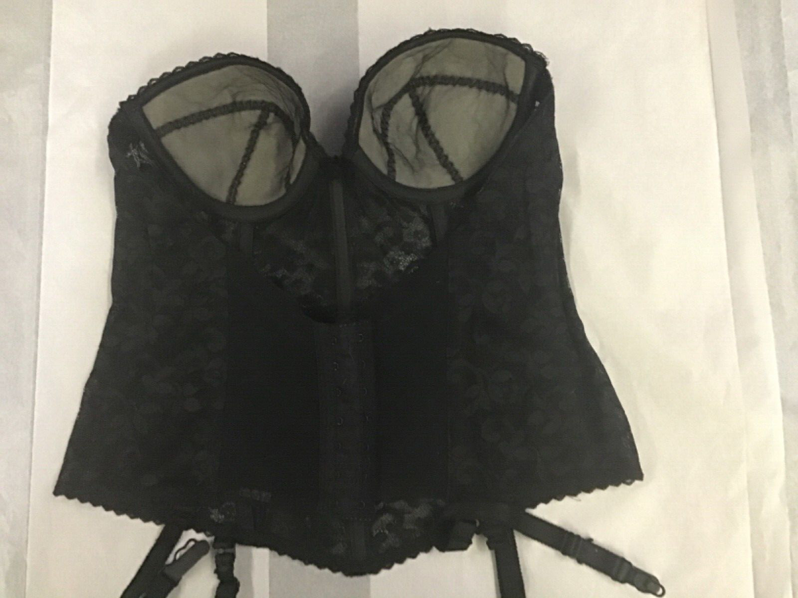 как выглядит Vintage BLACK LACE STRAPLESS PADDED 9 BONED 4 GARTER STRAP Merry Widow 36B фото