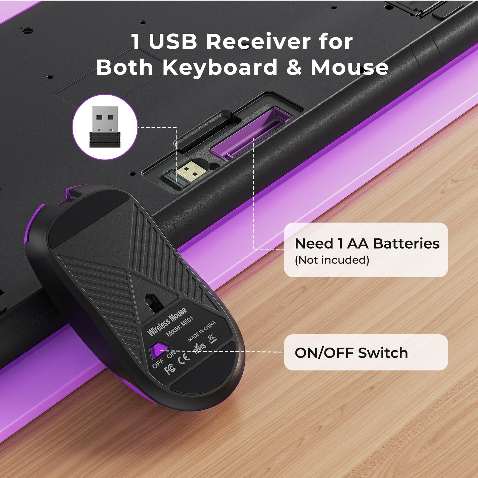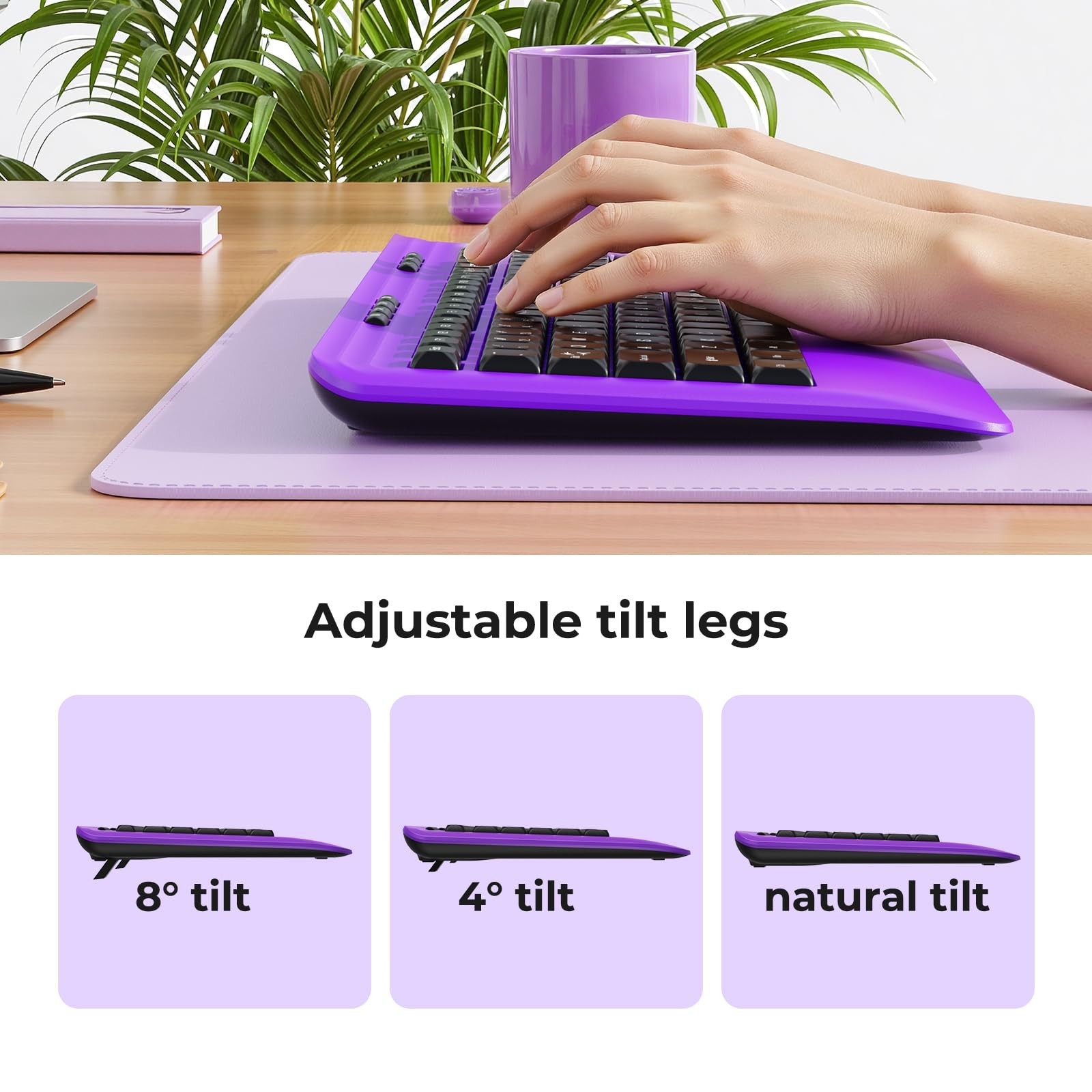 Wireless Keyboard and Mouse Set with Quiet Keys, 2.4G Full Size Purple Keyboa...