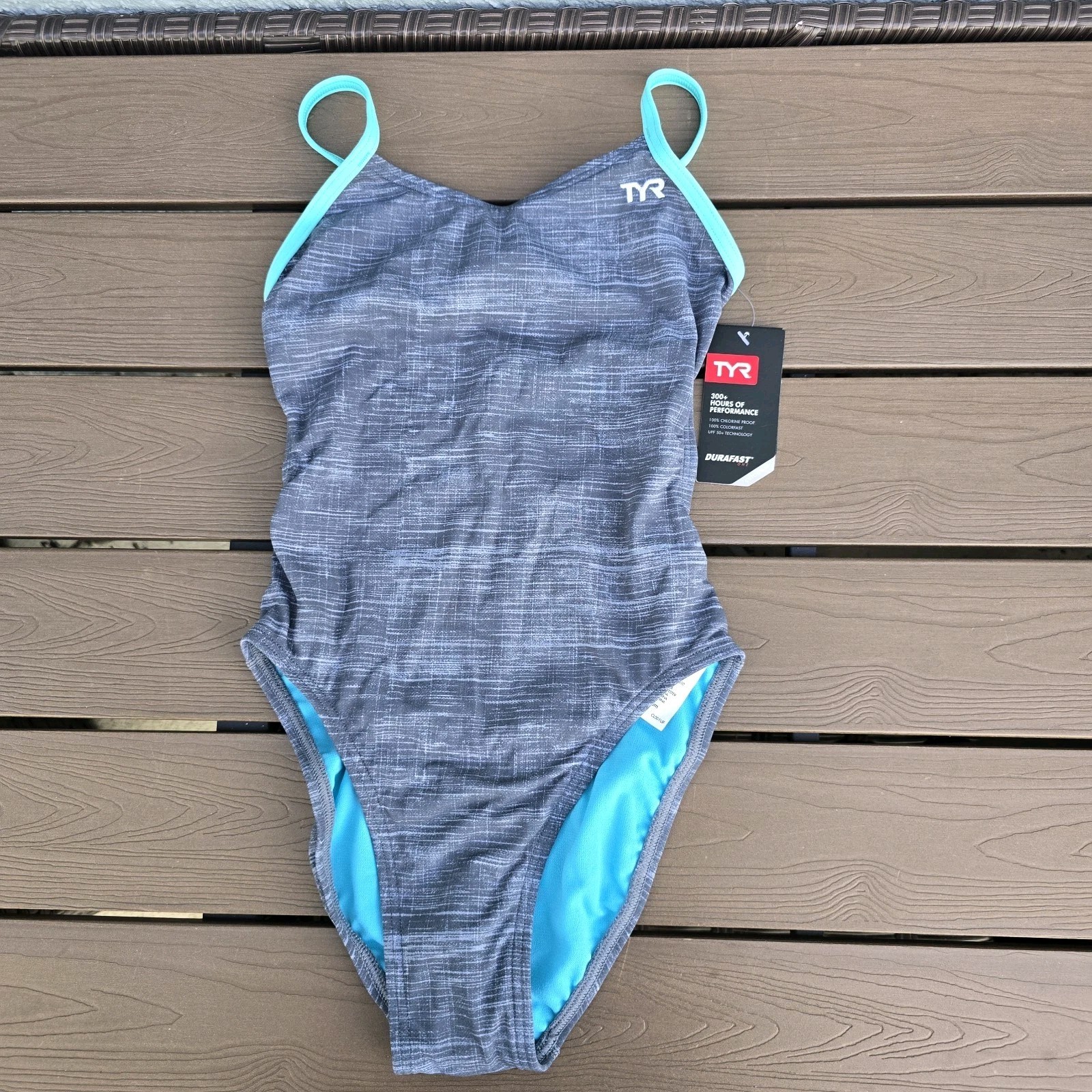 TYR Durafast Youth Girl Grey/Teal Sandblasted Cutoutfit 1 Piece Swim SZ 26 New