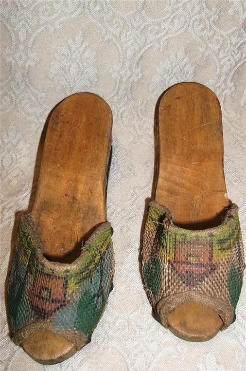 как выглядит SWEET VINTAGE WW II GIRLS CARVED WOOD CANVAS WOODEN SHOES PHILIPPINES 6-1/2" фото